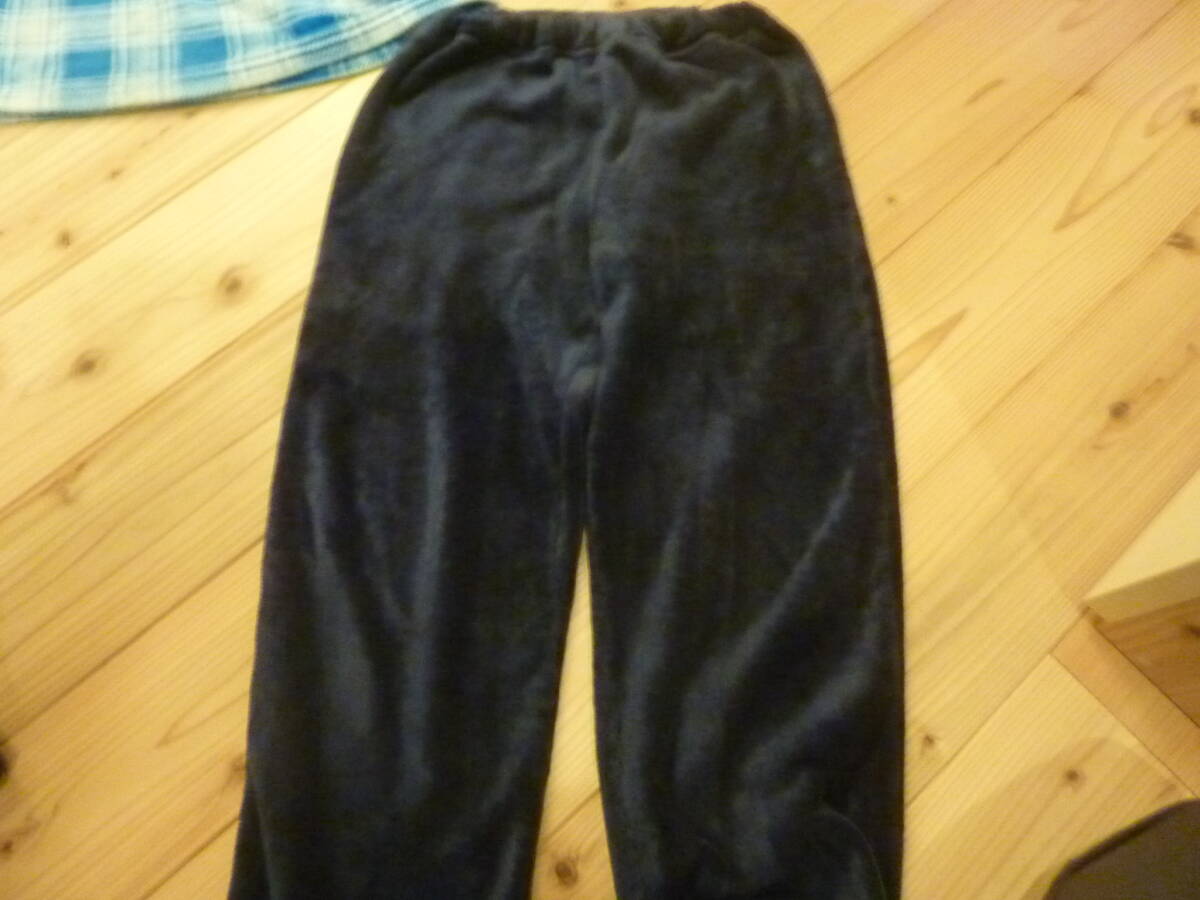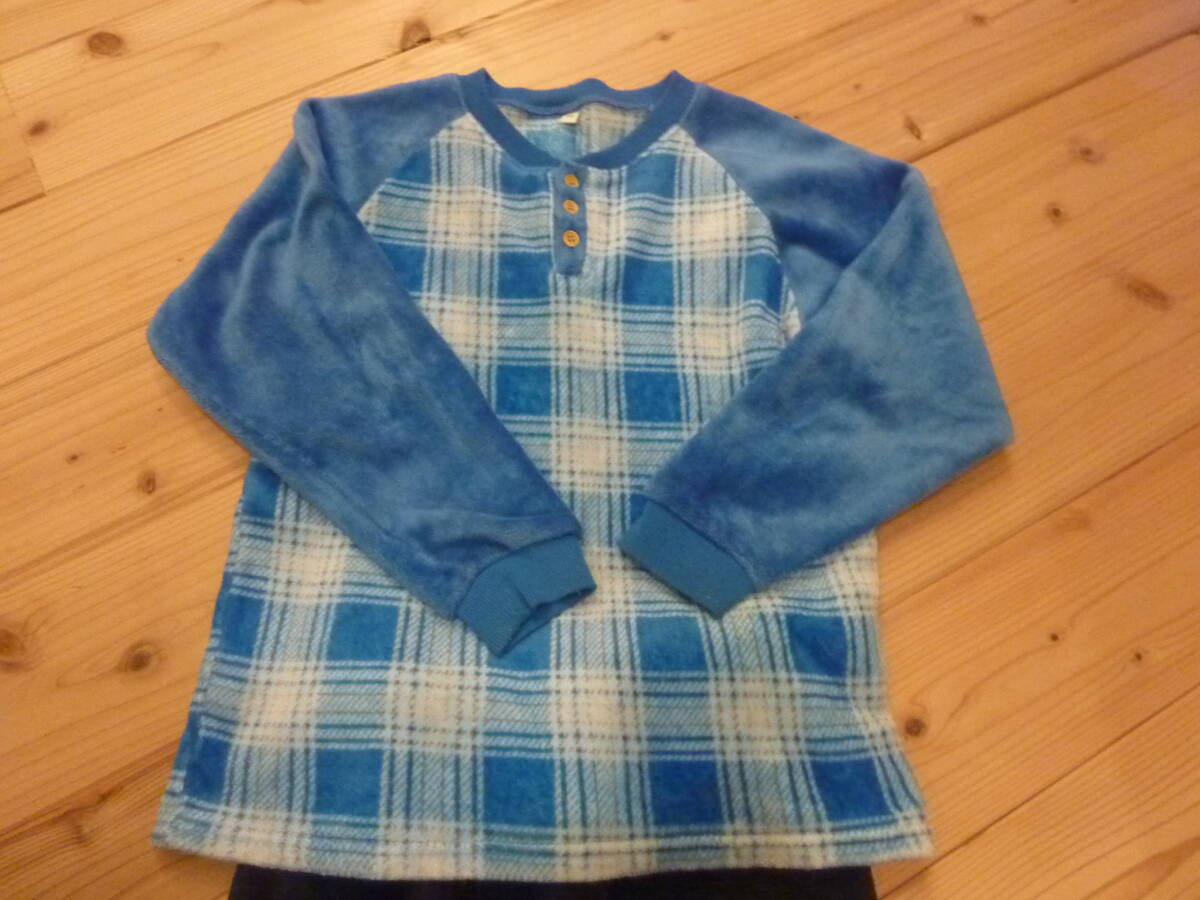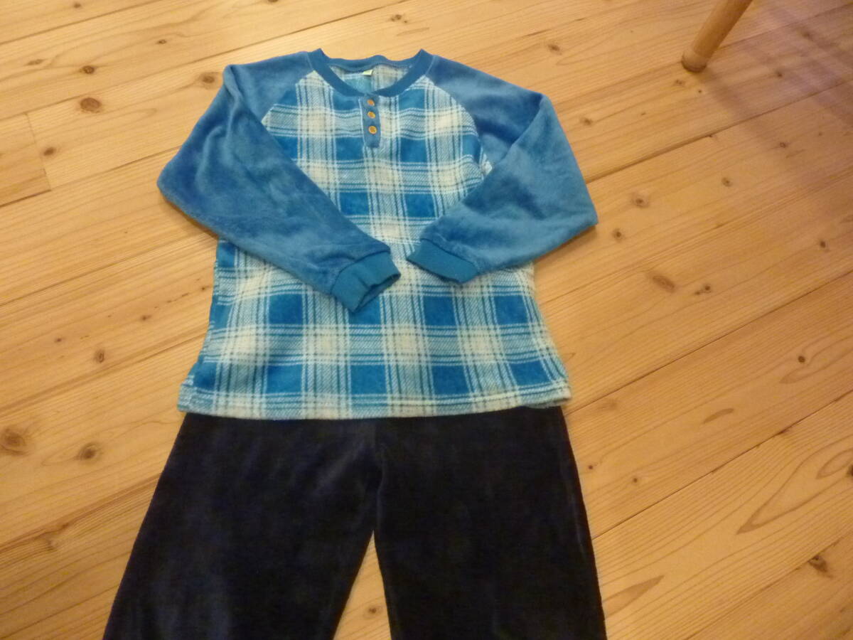 フリース素材の青系チェック柄パジャマ、サイズ140、長袖デザイン。 - 色: 青系のチェック柄 - サイズ: 140 - 素材: フリース - デザイン: 長袖、ボタン付き - パンツの色: 黒 性別...男の子 カラー...ブルー系 袖丈...長袖