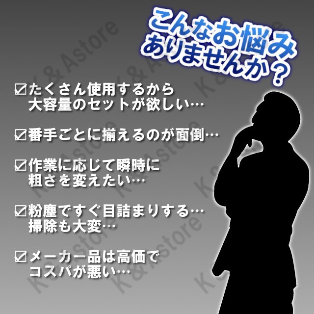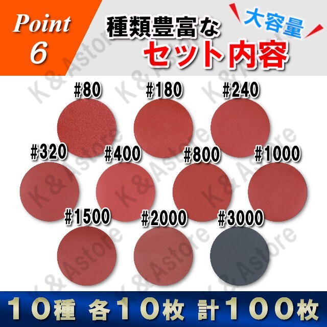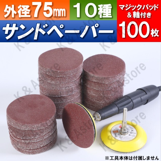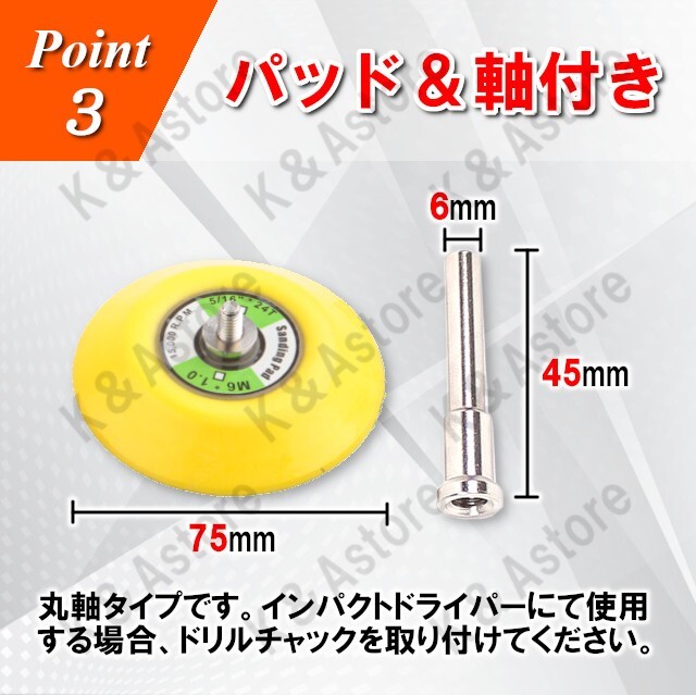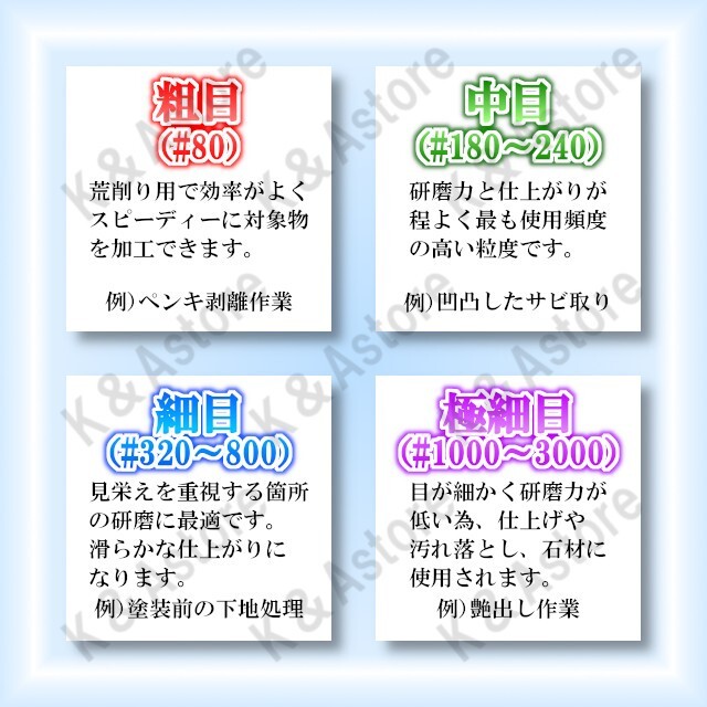 粗目・中目・細目が一つになったサンドペーパーセットです。 アストロ、マキタ、リョービ、ハイコーキ、 ボッシュなどの電動・エア工具をお持ちの方にオススメです。 お車・バイク等の板金、サーフボード修理、ハンドメイド、家具製作、DIY、リフォーム等にご使用いただけます。 ☆マジック式☆ 簡単に脱着可能です。 ☆ミニサイズ☆ 局所や、部分的な加工に最適です。 ☆すぐ使える☆ 軸&パッド付きで即作業可能です。 【作業用途】 ・研磨 ・サビ落とし ・塗装剥がし ・下地処理 ・艶出し、仕上げ 【適応素材】 ・各種金属 ・木材 ・プラスチック(FRP等) ・人工大理石 ・レザー 【セット内容】 #80 #180 #240 #320 #400 #800 #1000 #1500 #2000 #3000 ・各種×10枚、計100枚 ・6㎜軸×1 ・マジックパッド×1※ネジ径はM6×P1.0 【サイズ】 ・75㎜径 【材質】 ・酸化アルミニウム(A) 【発送】 ・平日は毎日発送します。土/日は発送お休みです。 ※金曜日の発送後にご購入いただいた場合は、翌週の月曜日の発送になります。