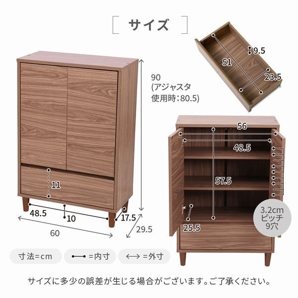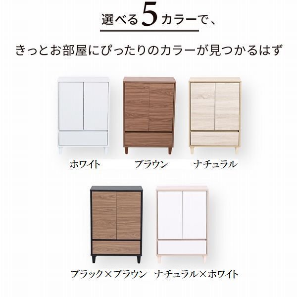 | 【カラー】 ホワイト、ブラウン、ナチュラル、ブラック×ブラウン、ナチュラル×ホワイト 【サイズ】 <外寸> 幅60×奥行29.5×高さ90(アジャスター80.5)cm <内寸> 扉内:幅48.5(有効56)×奥行25.5×高さ57.5cm 可動棚:幅56×奥行25.5×厚み1.5cm(3.2cmピッチ9穴) 引き出し:幅51×奥行23.5×高さ9.5(有効11)cm 【材質】 <ホワイト> [本体:プリント紙化粧合板 天板・扉:合成樹脂化粧合板(PVC) 引き出し前板:合成樹脂化粧繊維板(PVC) 脚:天然木 <ブラウン、ナチュラル> 本体:プリント紙化粧合板 引き出し前板:プリント紙化粧繊維板 脚:天然木 <ブラック×ブラウン> 本体:プリント紙化粧合板 天板:合成樹脂化粧合板(PVC) 引き出し前板:プリント紙化粧繊維板 脚:天然木 <ナチュラル×ホワイト> 本体:プリント紙化粧合板 扉:合成樹脂化粧合板(PVC) 引き出し前板:合成樹脂化粧繊維板(PVC) 脚:天然木 【耐荷重】 天板:(約)10kg以下 可動棚:各(約)5kg以下 扉内固定棚:(約)5kg以下 引き出し:(約)5kg以下 【生産国】 中国 【梱包】 サイズ:83×33.2×19.5cm、重量:18.8kg 【その他】 ・可動棚2枚 ・背面化粧なし ・脚裏フェルト付き ・アジャスター付き 【組み立て品】 お客様による組み立てが必要です。 【ご注意】 ・サイズ、重量は概算です。 ・商品カラーはご使用のモニターによって実際の明るさや色と異なって見える場合がございます。 |