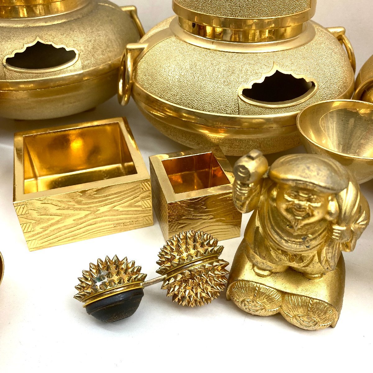 | サイズ・仕様 | 24K GP 金メッキ ・盃 ・朱肉 ・酒器 ・茶釜 など 合計 131点 重量:約15kg ※サイズは実寸となりますので、多少の誤差がある場合がございます。 |