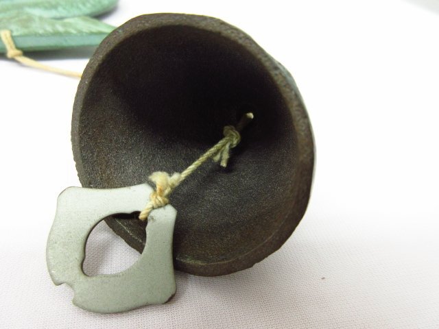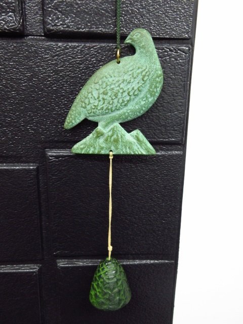 未使用保管品 鉄製 風鈴 雷鳥?鳩? 鳥類 総重量約380g 釣鐘直径約4cm グリーン 金属工芸/コレクション/和風インテリアなど