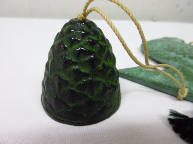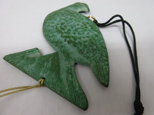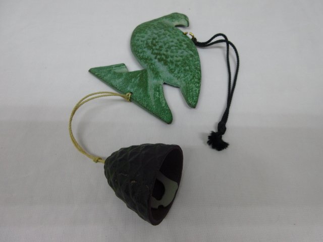 m1996 未使用保管品 鉄製 風鈴 雷鳥?鳩? 鳥類 総重量約380g 釣鐘直径約4cm グリーン 金属工芸/コレクション/和風インテリアなど