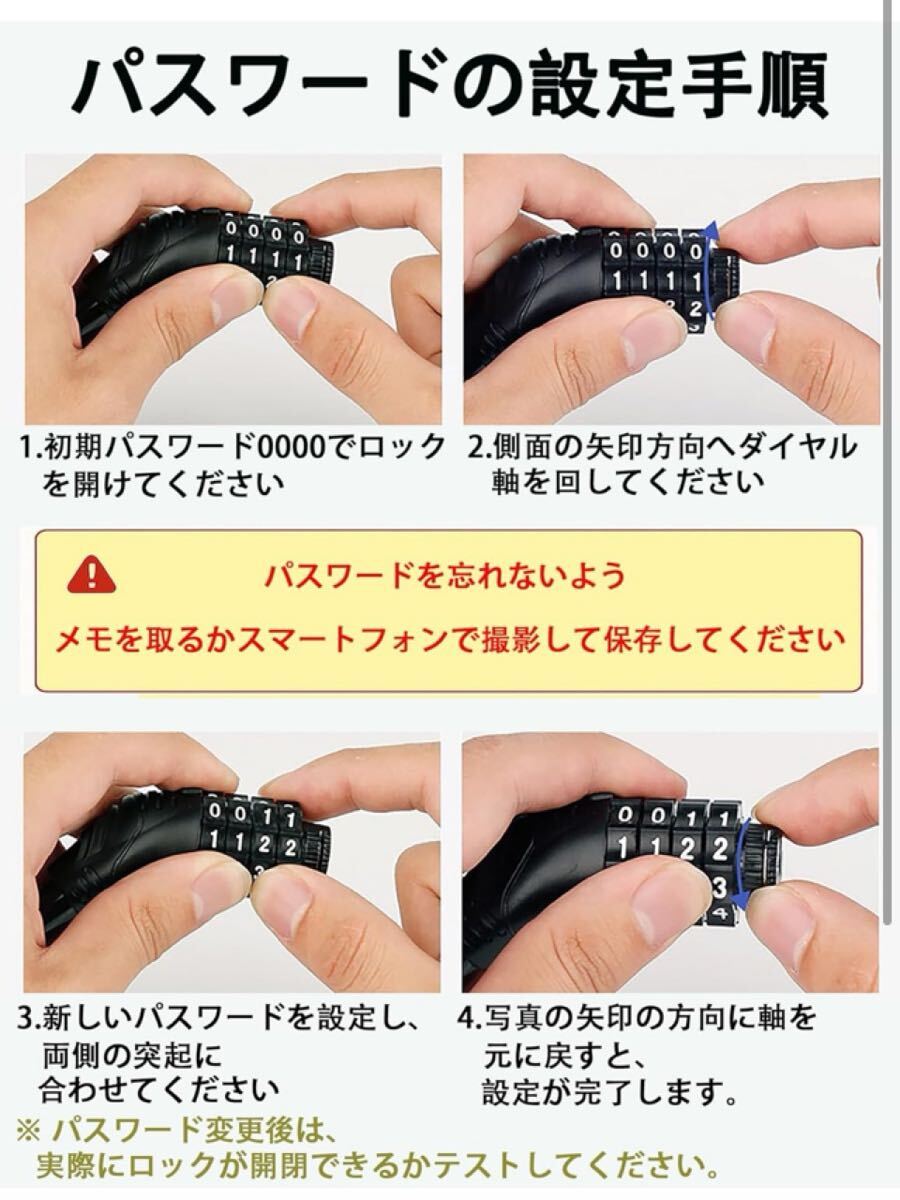 パスワードの変更方法は非常に簡単で、迅速に完了できます。 さらに、軽量でコンパクトなサイズのため、日常の持ち運びでも負担になりません。 加えて、太いスチールケーブルを使用することで、突然の引っ張りや切断から効果的に保護し、自転車の安全性を著しく向上させます。