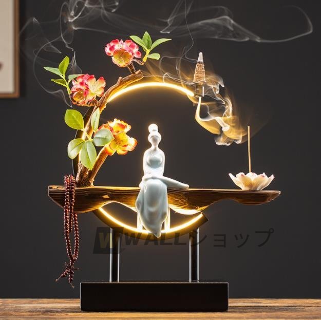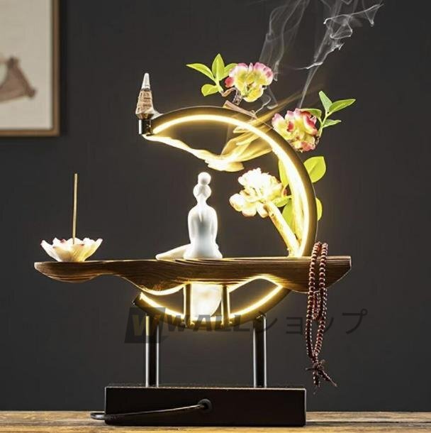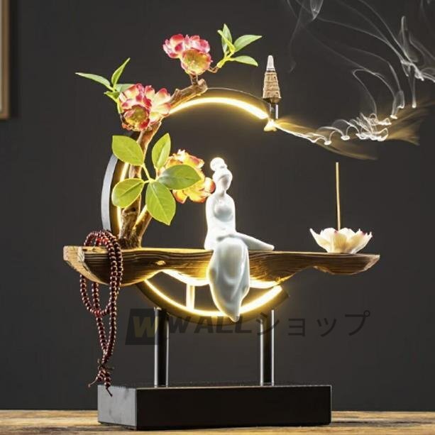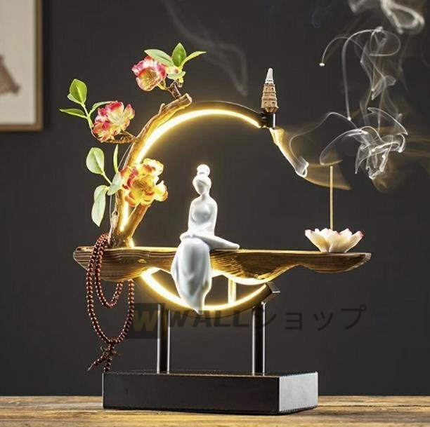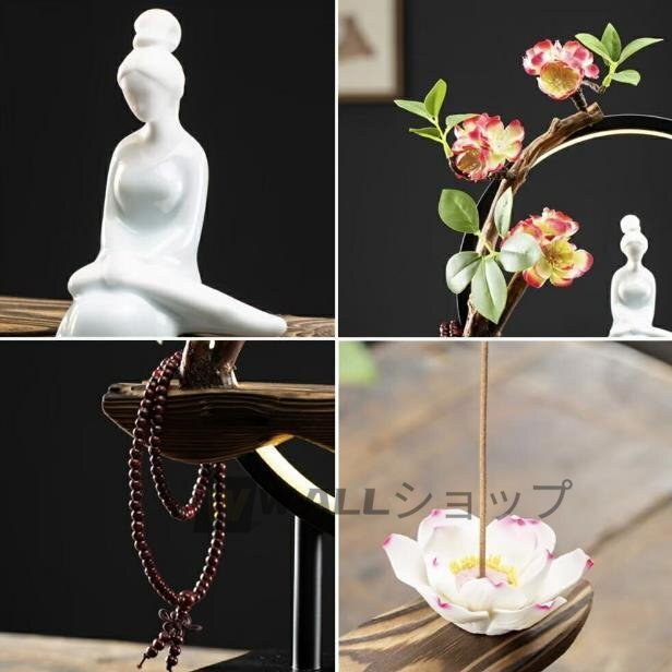 高級感満載★お香立て LED 花 座る 女神 木製 数珠 ライト 幻想 インテリア 置物 香り 匂い 玄関