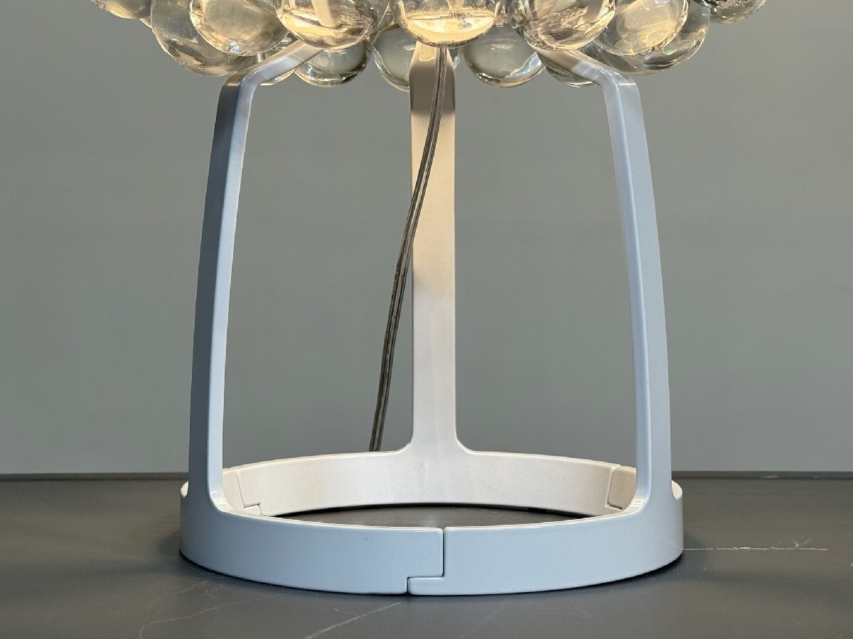 無数のガラスビーズをセードとして搭載し、アイコニックでチアフルな子ども用のブラスレットをシャンデリアのような煌びやかさをまとわせてオマージュした、アイコニックな現代ファッションシーンを牽引してきた ELLE / エルのグラフィックデザインの鬼才・グラフィックデザインのEliana Gerotto / エリアナ・ジェロットと現代最高峰のデザイナーと名高い女流デザイナー・ Patricia Urquiola / パトリシア・ウルキオラのデュオの放つ、ブランドを代表するテーブルスタンドクリエイション。FOSCARINI より。