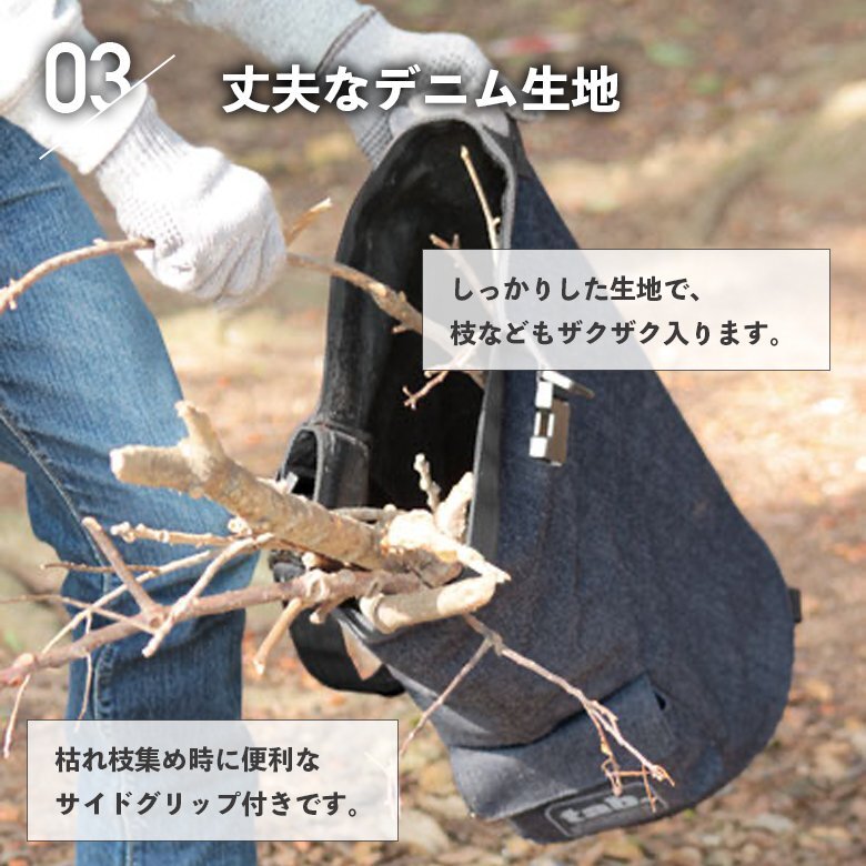 ・丈夫なデニム生地で長い枝や薪も気にせず詰め込めます。