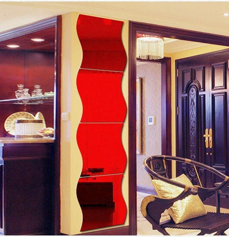 割れない鏡 ウェーブ×スクエア ウォールデコレーションミラーステッカー 【レッド 40㎝】 鏡 シール インテリア 海外モダン