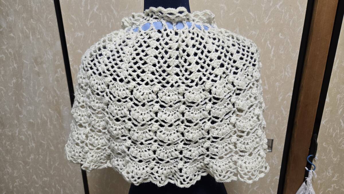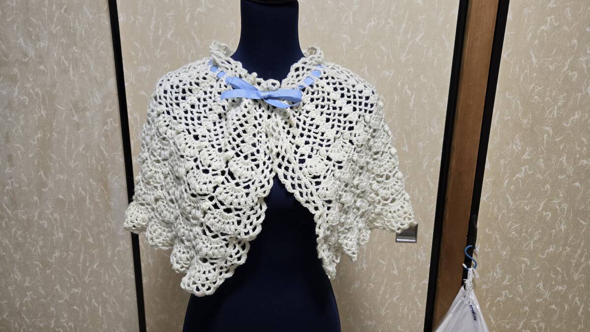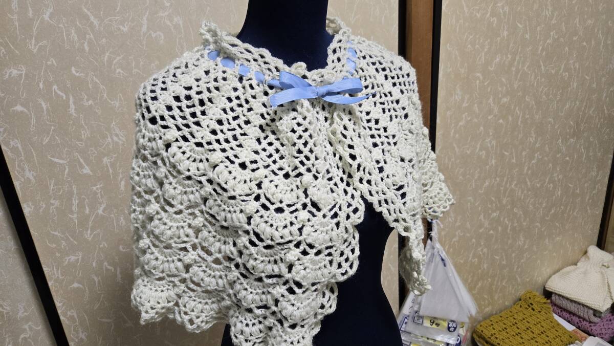 ★ポリエステル100%毛糸★手編み★リボン結びのケープ(ホワイト)♪送料無料♪【商品説明を必ずご覧ください】