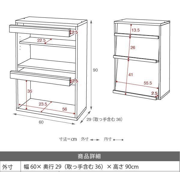 | 【カラー】 ホワイト、ナチュラル 【サイズ】 <外寸> 幅60×奥行29(取っ手含む36)×高さ90cm <内寸> 上下部:幅56×奥行23.5×高さ35cm 上飾り棚小:幅55.5×奥行2.5×高さ13.5cm 上飾り棚大:幅55.5×奥行2.5×高さ26cm 下飾り棚:幅55.5×奥行2.5×高さ41cm 可動棚:幅56×奥行22.5×厚み1.8cm(3.2cmピッチ5穴) 【材質】 本体:プリント紙化粧合板 【生産国】 ベトナム 【梱包】 サイズ:68×46×23cm、重量:31kg 【その他】 可動棚:1枚 【組み立て品】 お客様による組み立てが必要です。 |