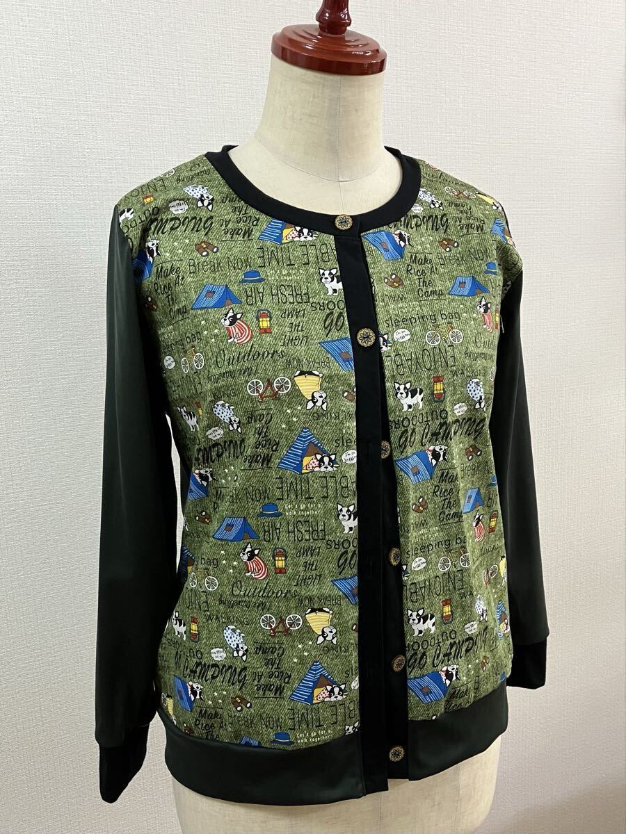 お色は深緑系無地、黒系無地、緑系に青や黄色の犬柄布帛生地との切替カーディガンです。シ袖はまくってもずり落ちにくいよう二重仕立て、前にウッド系のボタンが6個付いてます。シワになりづらい素材感のコットン生地なのもおすすめのポイント♪透け感なし伸縮性あり(布帛生地はなし)