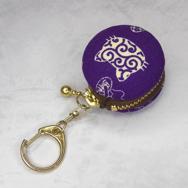 ○マカロンコインケース○和柄 ねこフェイス 紫色 40㎜○ハンドメイド 唐草模様 YKKファスナー