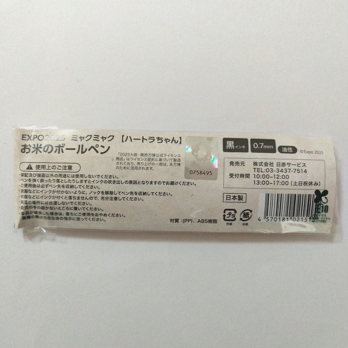 大阪・関西万博公式ライセンス商品、ハートラちゃん&ミャクミャク お米のボールペンです。