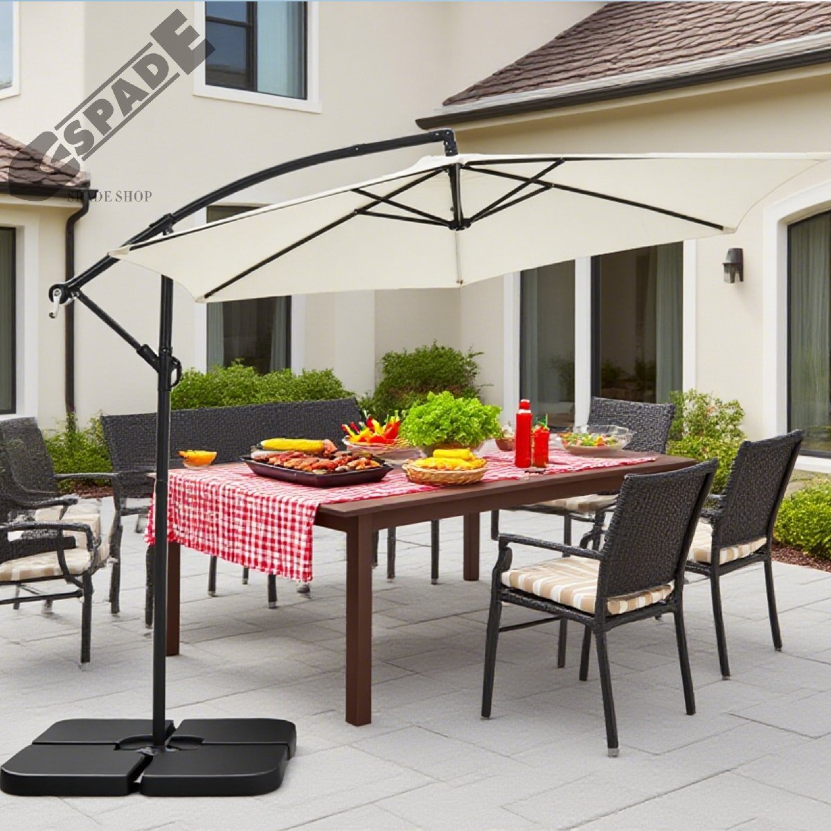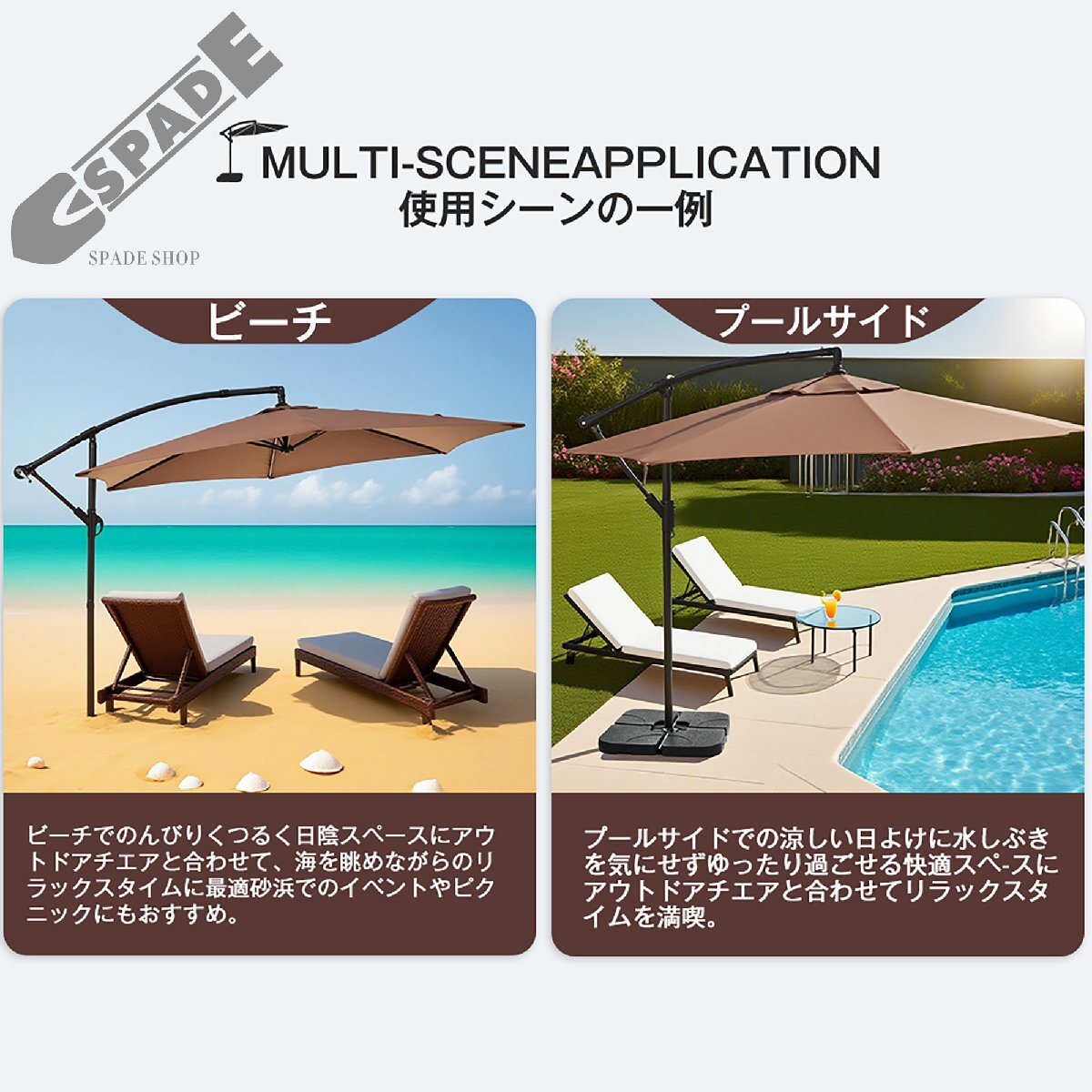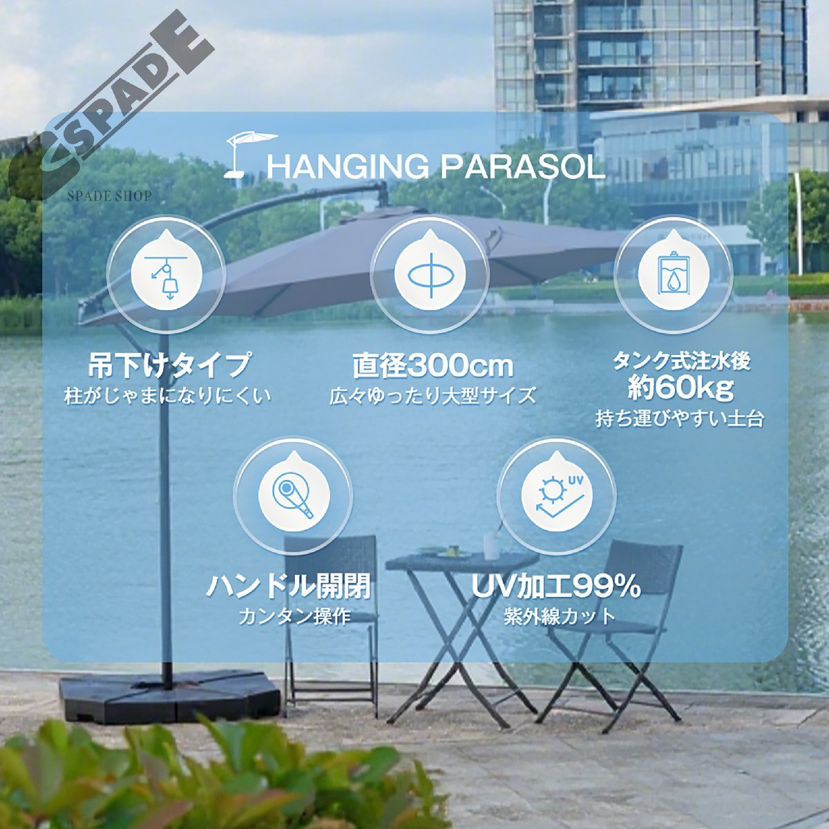 • 【広々とくつるげるワイド】空間を妨げない吊り下げタイプ支柱が邪魔にならない吊り下げタイプなので、パラソル下を無駄なく広々使えます。 広げると傘径約300cmになる大型パラソル。 アウトドア用のテープルと椅子をすっぱりカバーできるほど広いです!