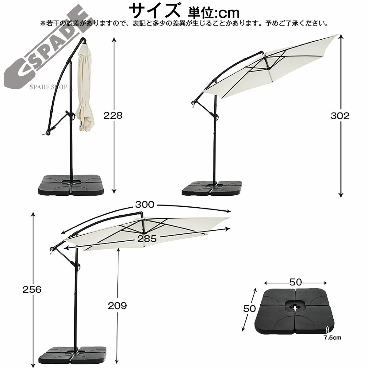 • 【安定感拔群】ベースは水/砂を入れて使うタイプ。 注水後: 約60kg 注砂後: 約80kgになり、コンパクトながらもしっかりとパラソルを支えます。ベースは4分割仕様で持ち運び可 ベースは4分割で、持ち運びしやすく工具不要で設置と徹去可能。