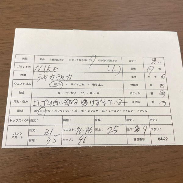 - ブランド:NIKE - サイズ表記:L - 素材:ポリエステル - カラー:黒 - シーズン:春夏 - 服の特徴:ランニング向けショートパンツ、軽量素材、ウエストゴム仕様 シャカシャカ - ダメージ・汚れ詳細:ロゴ部分に若干の剥げあり 管理番号: 04-22 即購入大歓迎・お得な割引各種あります 詳しくはプロフィールをご覧ください! 匿名&送料無料 海外輸入のため全て一点ものです 古着のため使用感・毛玉等があることもあります。写真で状態の確認を行なってからご購入ください おまとめ買いでお得な割引あります♪ 平置き採寸表→写真から確認いただけます! (素人採寸のため、多少の誤差はご了承ください) 商品状態に関しては、写真、商品説明欄に記載しております。着用回数、購入時期などはお答えできませんので、ご了承ください。着画、写真の追加もお断りしております。 簡易包装のコンパクト発送となります。 畳みシワはご了承の程、宜しくお願いいたします。 商品によっては圧縮してお送りするものもございます。 撮影環境や使用するモニター、反映されにくい色味など、 商品と画像に若干の色誤差が生じますことをご了承ください。 出品作業の際にしっかりと確認はしておりますが、シミなどの見落としがある場合もございますのでご了承下さい。 古着の取り扱いになりますので特有の匂い等がある可能性があります。ご理解のある方のみご購入の程お願い致します。