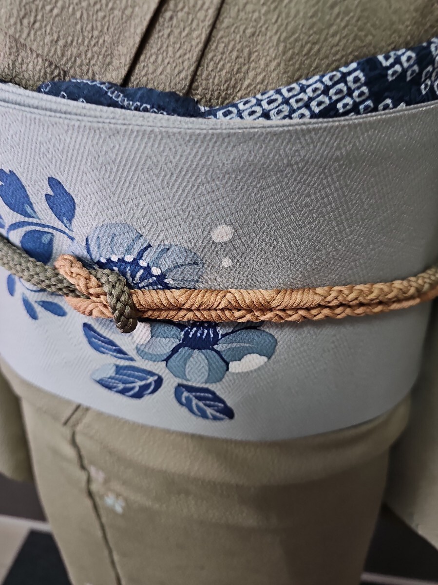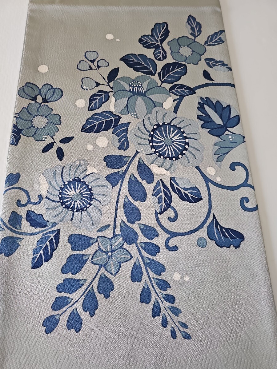 ★良い塩梅の張りを有する滑かな織地、やや青みがかった灰系、地に金通しを施した織地文様、藍系の花文様が静かな個性美を醸し出す上等なお品ものでございます。