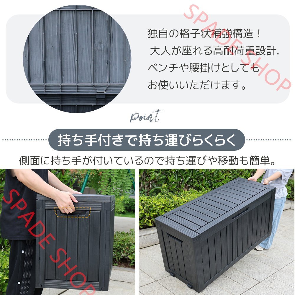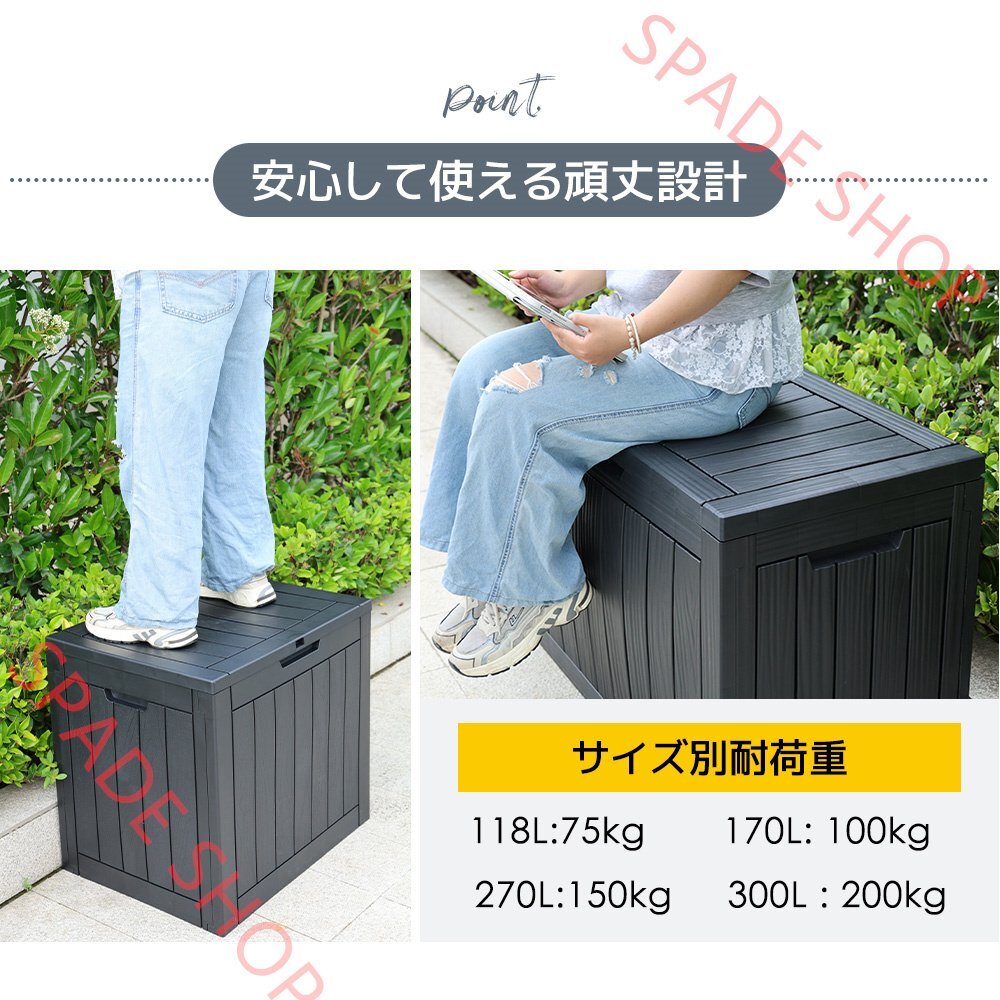 • 【ご用途に合わせて選べる4サイズ】118L--コンパクトで場所を選ばない基本サイズ--ベランダのちょい収納、ガーデニング道具、子供のおもちゃ収納、玄関先の靴箱代わりに。狭いスペースでも活用可!170L--スタンダードな使いやすさ--一般的な家庭の庭用品(芝刈機燃料、ホース、クッション)、自転車・バイク用品、キャンプギア収納に最適。270L--スタンダードな使いやすさ--重い工具・資材(土・肥料袋)、大型ガーデニング用品、非常用防災備蓄品の収納に。頻繁に動かす必要がある場所で活躍!300L--スタンダードな使いやすさ--大量の物品収納、重い機材、長期間の保管に最適。頻繁な開閉でも楽々!蓋の補強でより高い耐荷重性を実現。