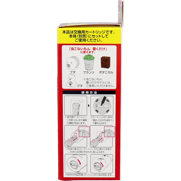 置き型・交換用 火・電池・コンセントは不要! ・効果は約1年間! ながーく虫よけ効果を発揮。 (使用環境により異なります。) ・モーター・ファンレス設計の無音タイプ。 ・寝室や静かな場所にもピッタリ。 ・交換時期を自動でお知らせ! ・無臭。 ・交換用です。 本体(別売)にセットしてご使用ください。 ブタ・プランツ・ボタニカル・クマ 【適用害虫】 ユスリカ 【使用の目安】 6畳までの広さの部屋に対し1個 【使用期間】 約1年間 (使用環境により異なります) 【有効成分】 トランスフルトリン (ピレスロイド系) 個装サイズ:53X132X53mm 個装重量:約51g 内容量:1個入 製造国:中国 【発売元:レック株式会社】 【使用方法】 (1)袋を開け、カートリッジを取り出します(薬剤の揮散が始まります)。 (2)カートリッジのつまみに開封した日付を油性ペンで書き込みます。 (3)本体差込口に、カートリッジの凸部分と本体の・印または凹部分を合わせ、差し込みます。 (4)矢印の方向に90度、カートリッジのつまみを回します。 【使用上の注意】 ・本来の用途以外には使用しないでください。 ★してはいけないこと ・カートリッジの中からメッシュを取り出さないでください。 ★相談すること ・万一身体に異常を感じた場合は、本品がピレスロイド系の殺虫剤であることを医師に告げて、診療を受けてください。 ★その他の注意 ・商品表示をよく読み、使用方法を守って使用してください。 ・カートリッジ中のメッシュに手を触れないでください。 誤って触れた場合は石けんでよく洗ってください。 ・アレルギー症状やかぶれを起こしやすい体質の人は、注意して使用してください。 ・小児やペットがもてあそぶ場所へ置かないでください。 ・観賞魚などのいる水槽の近くに本品を置かない、または水槽に本品が入らないようにしてください。 ・閉め切った部屋や狭い部屋で使用する場合は、時々部屋の換気をしてください。 ・本品は通常1年間効果が持続しますが、使用環境により早く終了する場合があります。 ・害虫が大量に発生し、次々に飛来する場合などは、殺虫エアゾールと併用してください。 ★保管および取扱い上の注意 ・火気付近、直射日光の当たる場所、高温になる場所を避け、小児やペットの手の届かない涼しいところに保管してください。 ・一旦使用を中断する場合は、吸着シートに保護フィルムを貼りビニール袋やラップなどに包み、密封して保管してください。 ・使用済みの本品は、他に転用しないで各自治体の定めによる方法に従って廃棄してください。 注意事項 ※予告なく成分・パッケージが変更になることがございます。 予めご了承ください。 *予告なく成分・パッケージが変更になることがございます。予めご了承ください *ダンボールを使用して発送する場合には、入数以下の個数の場合、 中古ダンボールを使用する場合があり、ご注文の商品とは異なるダンボールになる場合があります。 あらかじめ、ご了承ください。 |