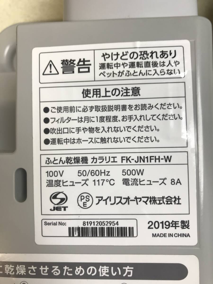 | 動作確認済み アイリスオーヤマ ふとん乾燥機 カラリエ FK-JN1FH-W くつ乾燥ノスル゛付き | |||