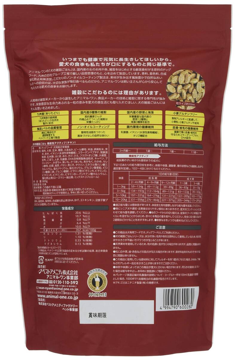 | 商品名 | アニマルワン ドッグフード 犬の雑穀ごはん 機能性アクティブ チキン 成長期の子いぬや6歳ごろまでの成犬 800グラム (x |