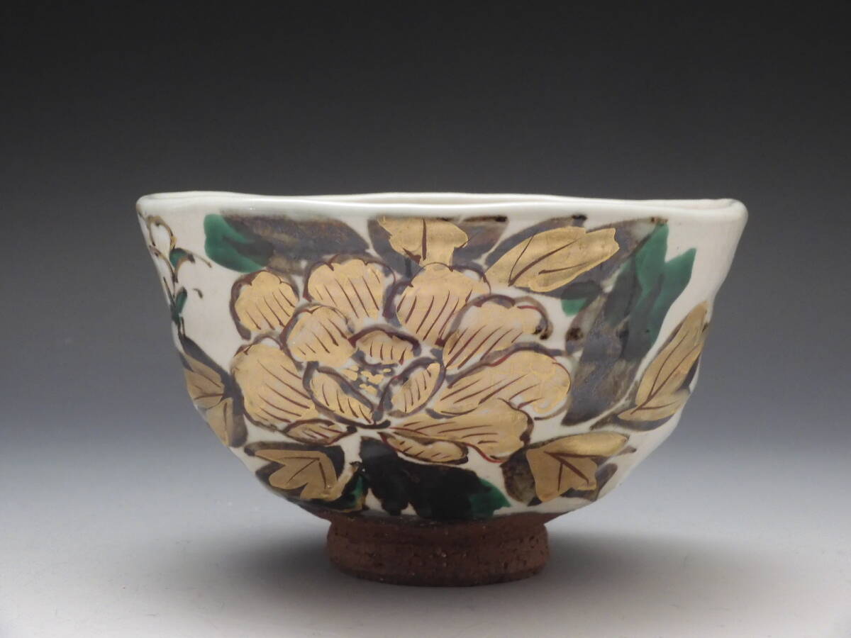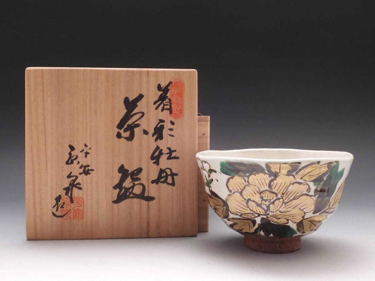 | ○梗○平安 京泉 造 色絵 牡丹 茶碗 茶道具 共布 共箱 無傷 E78◇ |