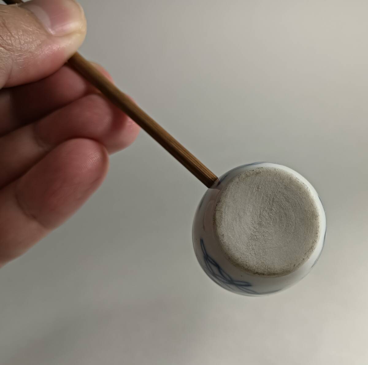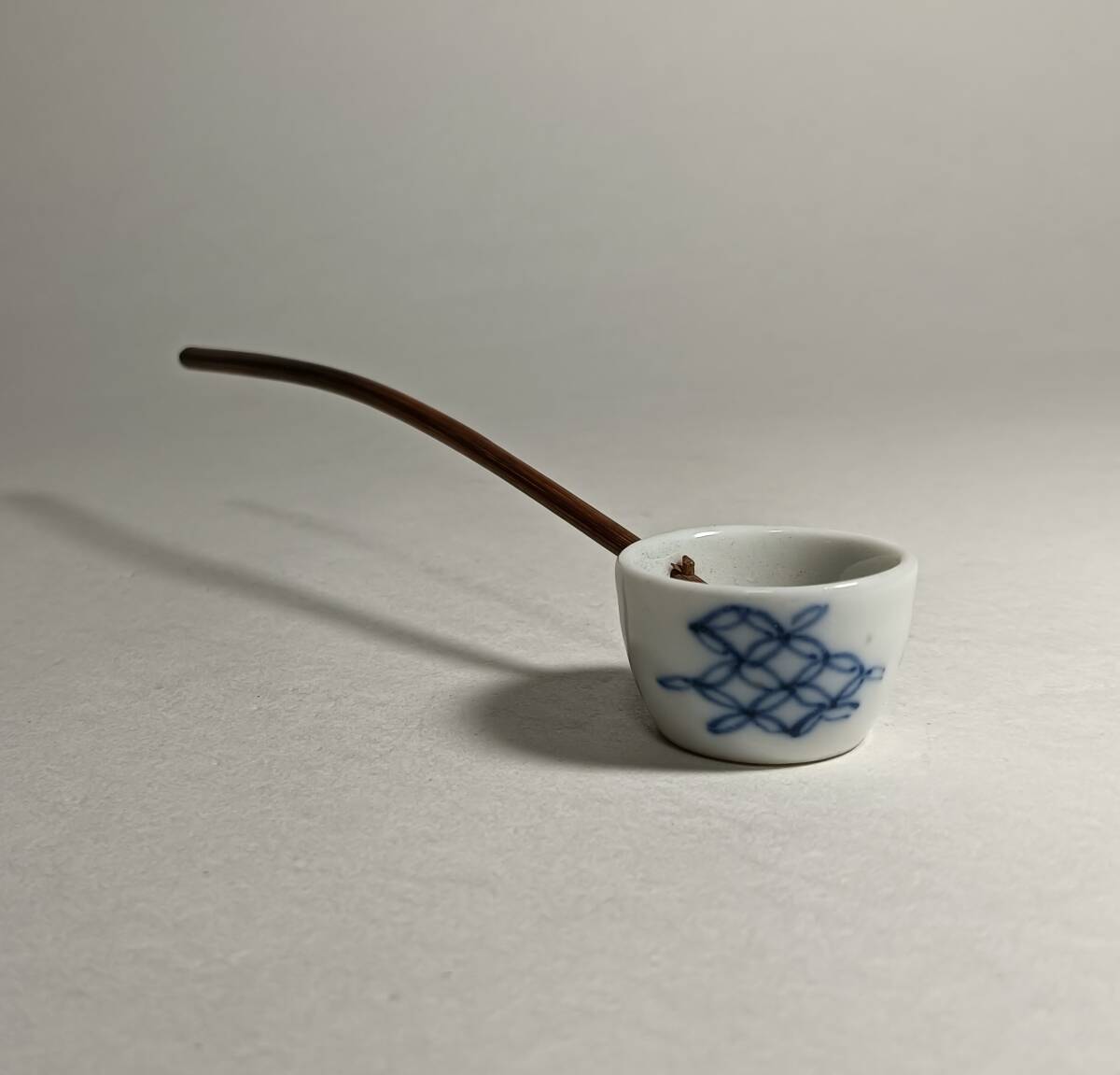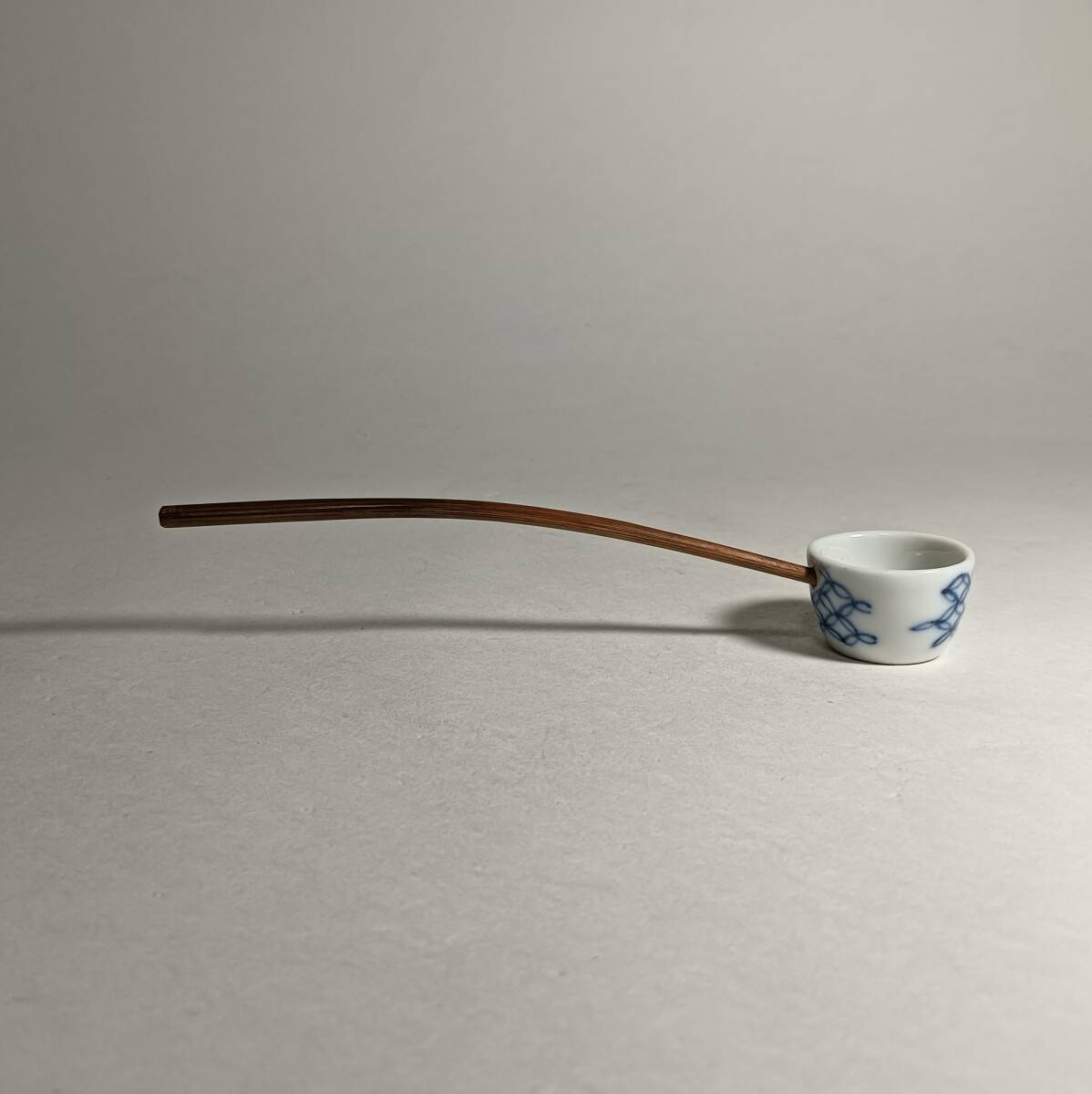 明治時代の染付七宝文の柄杓です。無キズ良好、伝世のきれいな品です。二本出たものの最後の一本です。手描きの七宝文が楚々とした美しさを湛えており清々しい作品です。対照的に趣きのある柄の木の味は艶々として民藝美そのものです。ちょっと褒め過ぎました。全体的にはちんまりとして可愛く他愛のない無邪気で気軽な作品です。次いつ会えるか分かりませんので、ぜひ(^^)