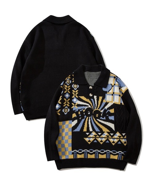 参考商品名:HOOK -original- 古着風 レトロ調パッチワック模様ポロ襟ニットスウェット