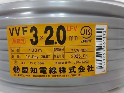 | 愛知電線 VVFケーブル 3×2.0mm 100m 16.0kg グレー 600V ビニル絶縁ビニルシースケーブル平形 3心 屋内配線 JIS C 3342 /未使用品 | ||||