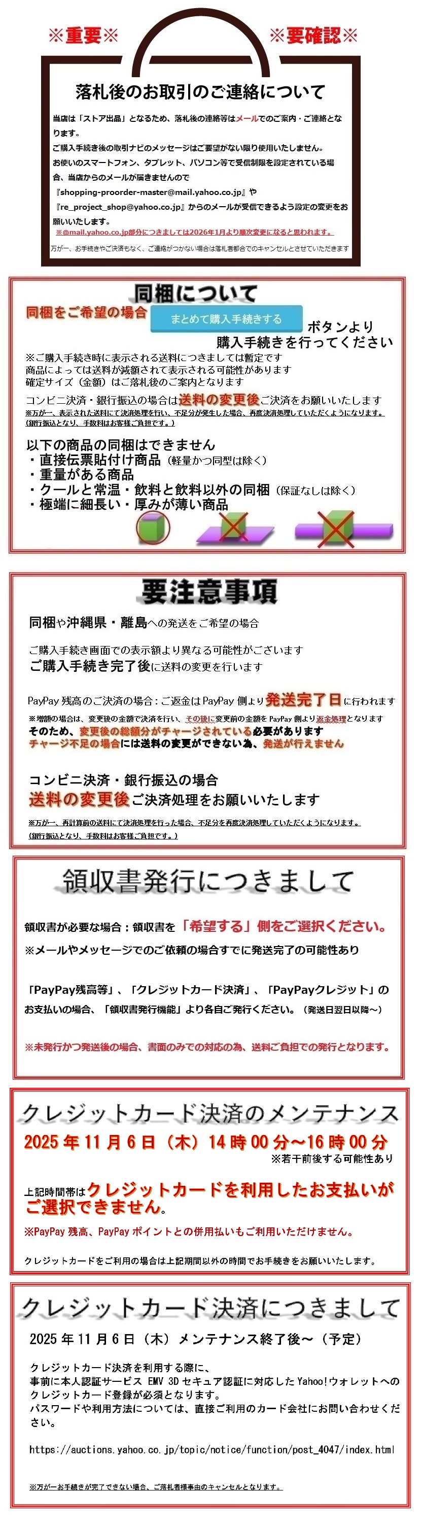 ※同梱可能商品に限ります。 定形郵便や定形外郵便(規格内)と定形外郵便(規格外)の同梱(定形外郵便発送)につきましては 佐川急便をご選択の上、ご要望欄に定形外郵便発送希望とご入力ください。 ご購入手続きが完了ののち、当方より手動で『お支払い総額のご案内』と『送料の変更』をいたします。 ご決済時の注意事項は下記をご高覧願います。 ◆沖縄県・離島への発送、同梱希望の場合のご決済について ■クレジットカード決済、PayPayクレジット 再度オーソリゼーションが行われます。 万が一、通らなかった場合は銀行振込となります。 ■銀行振込の場合 ご案内前の内容ではご決済しないようにお願いいたします。 万が一、不足金額にてご入金いただいた場合、不足分の追加入金の確認ができるまで商品の発送ができませんのでご了承ください。 超過分につきましては、銀行振込にて手数料を差し引いてのご返金となります。 ■コンビニ決済の場合 (※12月はご利用できません) 再度お支払番号を発行いたしますので、新たなお支払番号にてご決済ください。 ■PayPay残高等払いの場合 ご購入手続き時の表示金額より減額・増額により、お手続きが異なります。 減額となる場合: 発送完了日にPayPay側より返金処理となります。 増額となる場合: 変更後の金額で決済を行い、 その後に変更前の金額をPayPay側よりご返金処理となります。 ※増額となる際にチャージ不足の場合には、送料の変更ができない為、発送が行えません。 不足額のみのご決済はYahoo!オークションシステム上、銀行振込のみ対応可能です。 Yahoo!ショッピングヘルプ PayPay残高等払いについて(旧名称:PayPay残高払い・PayPay(残高)) https://support.yahoo-net.jp/PccShopping/s/article/H000011025#changeamount ◆普通郵便でのオプションについて