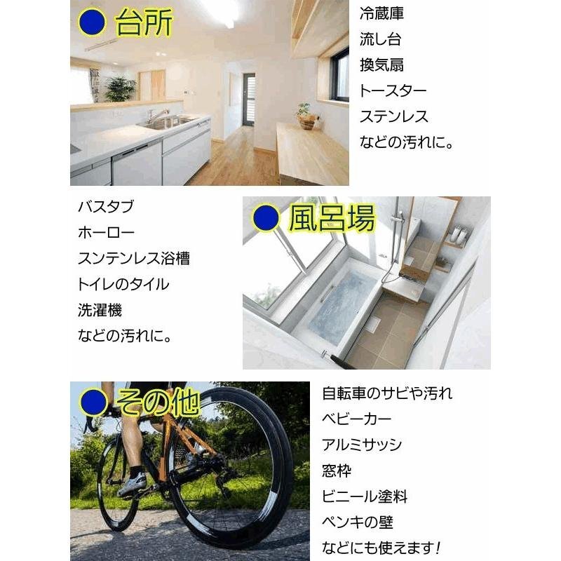 自転車・車のホイール等のサビ落とし、換気扇・ガスレンジ等の油汚れ落とし、洗面台等の湯あか落とし、冷蔵庫・電子レンジ等の汚れとり。