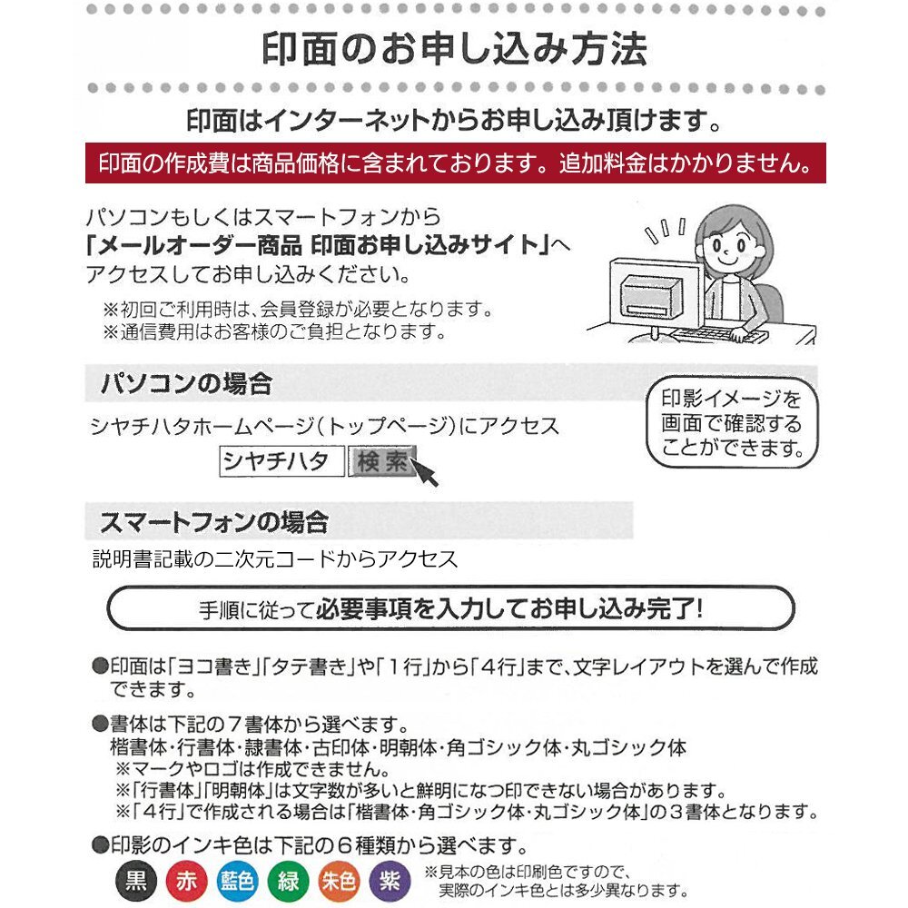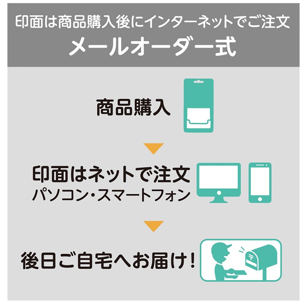 | ● 印面は受注(シヤチハタにて原稿確認)後、お届けします。 ● 年末・年始・夏期など長期休業前にお申し込みの場合や配達の事情によりお届けが遅れる場合があります。 ● 日本国外へのお届けはできませんのでご了承ください。 ● 印面のオーダーは、シヤチハタの「印面お申込みサイト」からお客様自身で行っていただく必要があります。 ● 印面のオーダー時の通信費・会員登録が必要となりますので、ご了承の上ご購入をお願いいたします。 | |