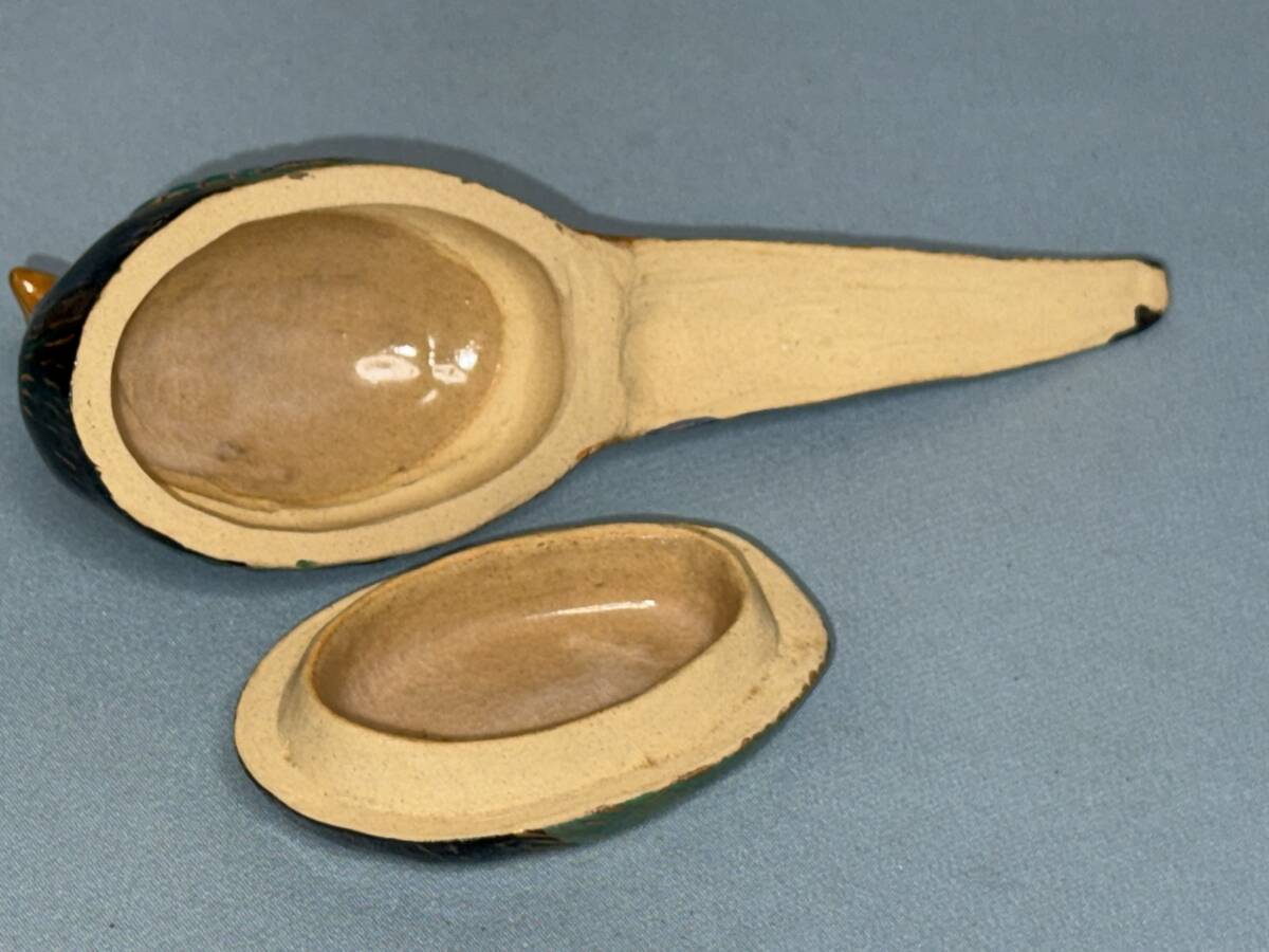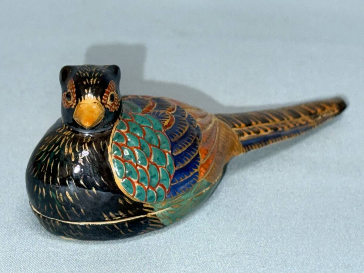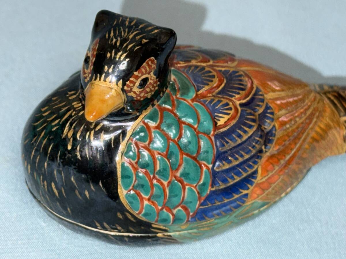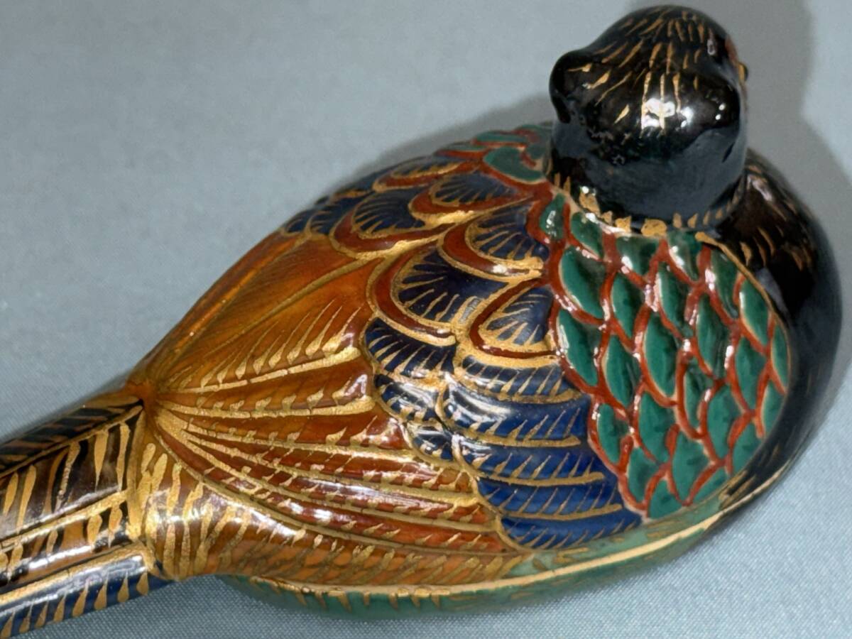 豪華な金彩を用い、色絵で細部まで丁寧に描かれ、顔の優しい表情を持つ、派手で華麗な雄雉の香合である。