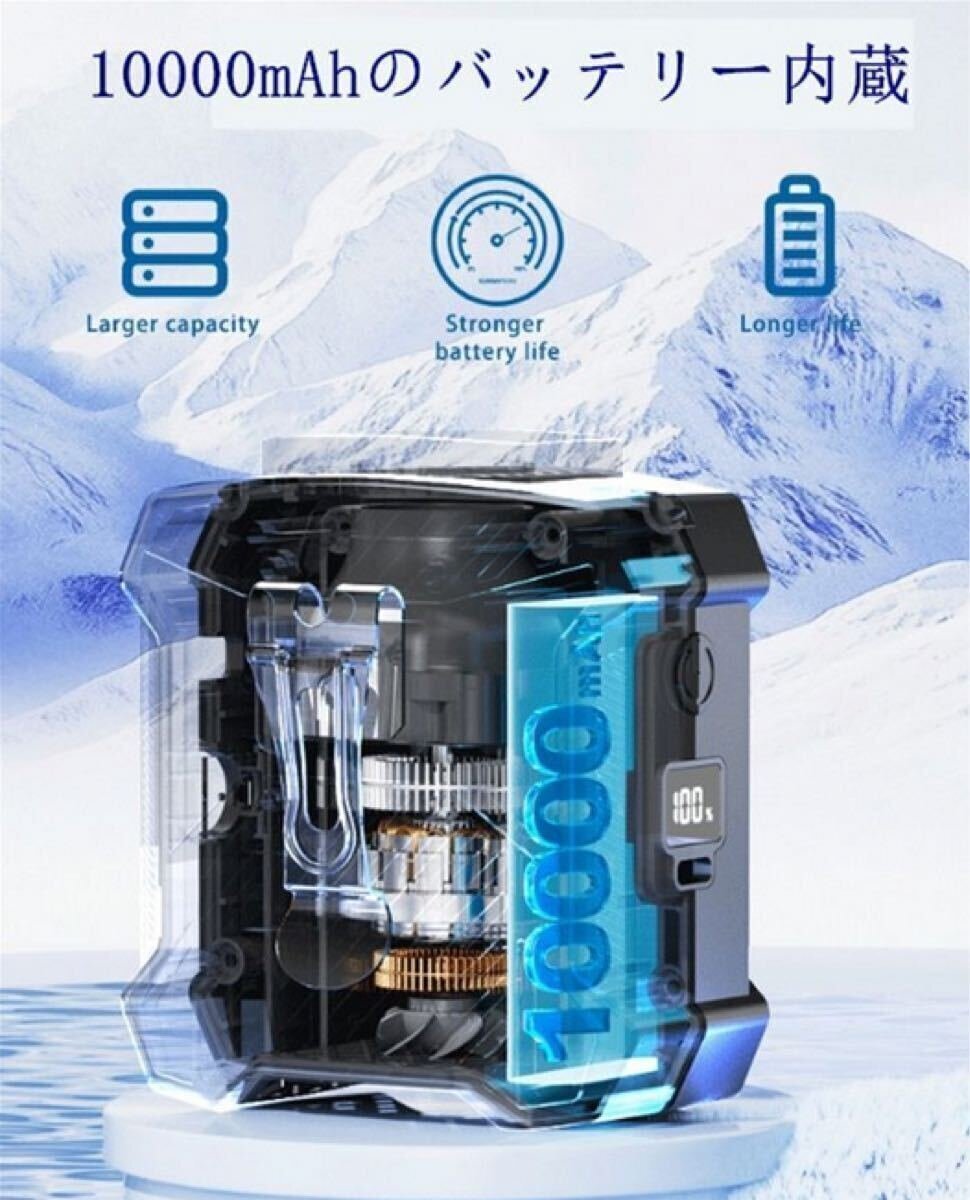 10000mAhの大容量電池が内蔵し、低電力消費で長時間の持続作動をサポートし、長時間で涼しい風をに楽しめます。