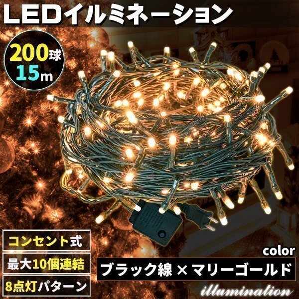 AC式 イルミネーション コンセント 連結可 LED イルミネーションライト ツリー ライト 200球 200灯 15m 黒線 マリーゴールド