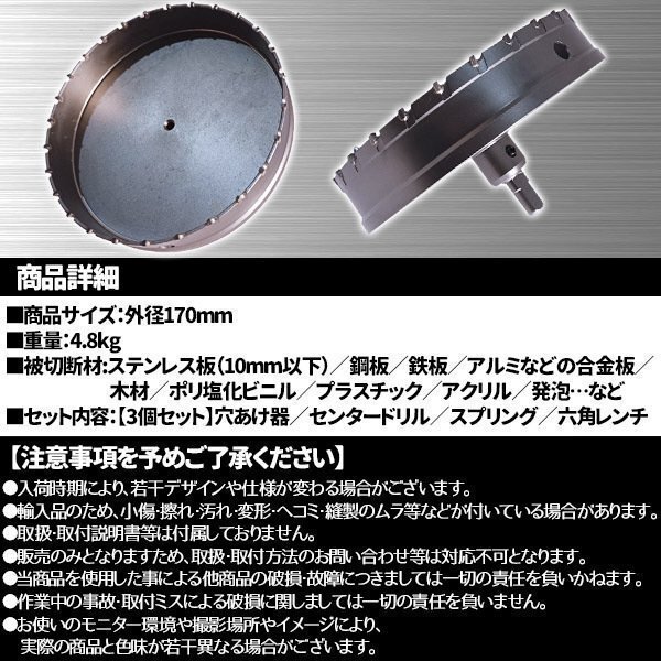 超硬 ステンレス ホールソー 穴あけ 電動ドリル ホルソー ホールカッター 3個セット (170mm)