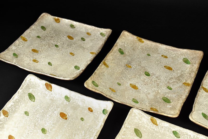 【蔵A4949】清水焼 魯山人写 平安(馬場)京泉 銀彩水玉文 四方皿 五客 共箱