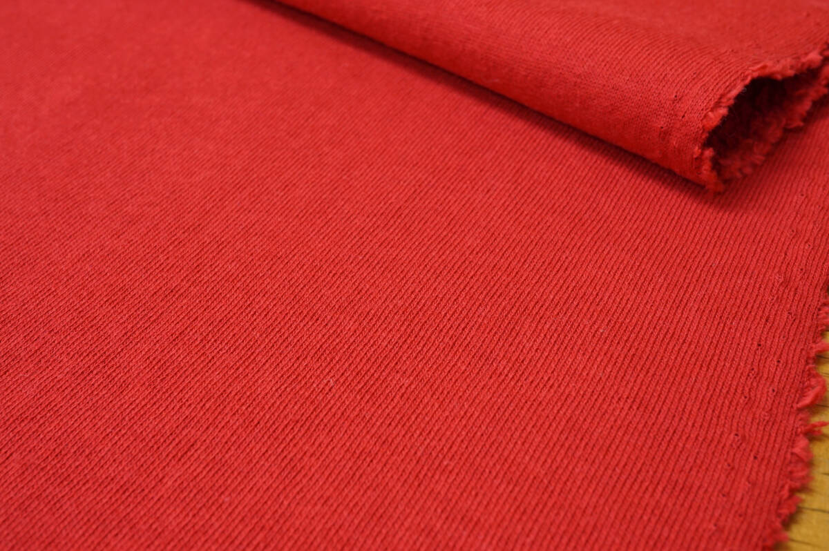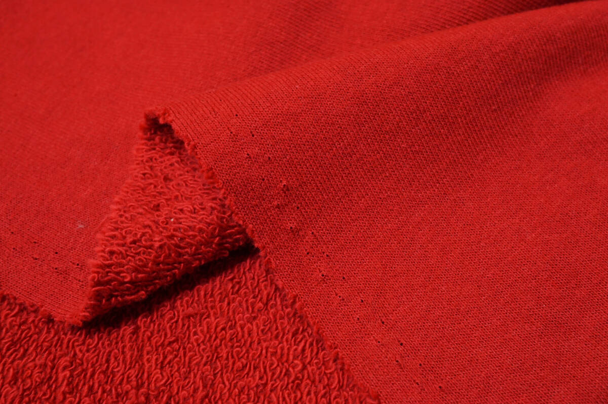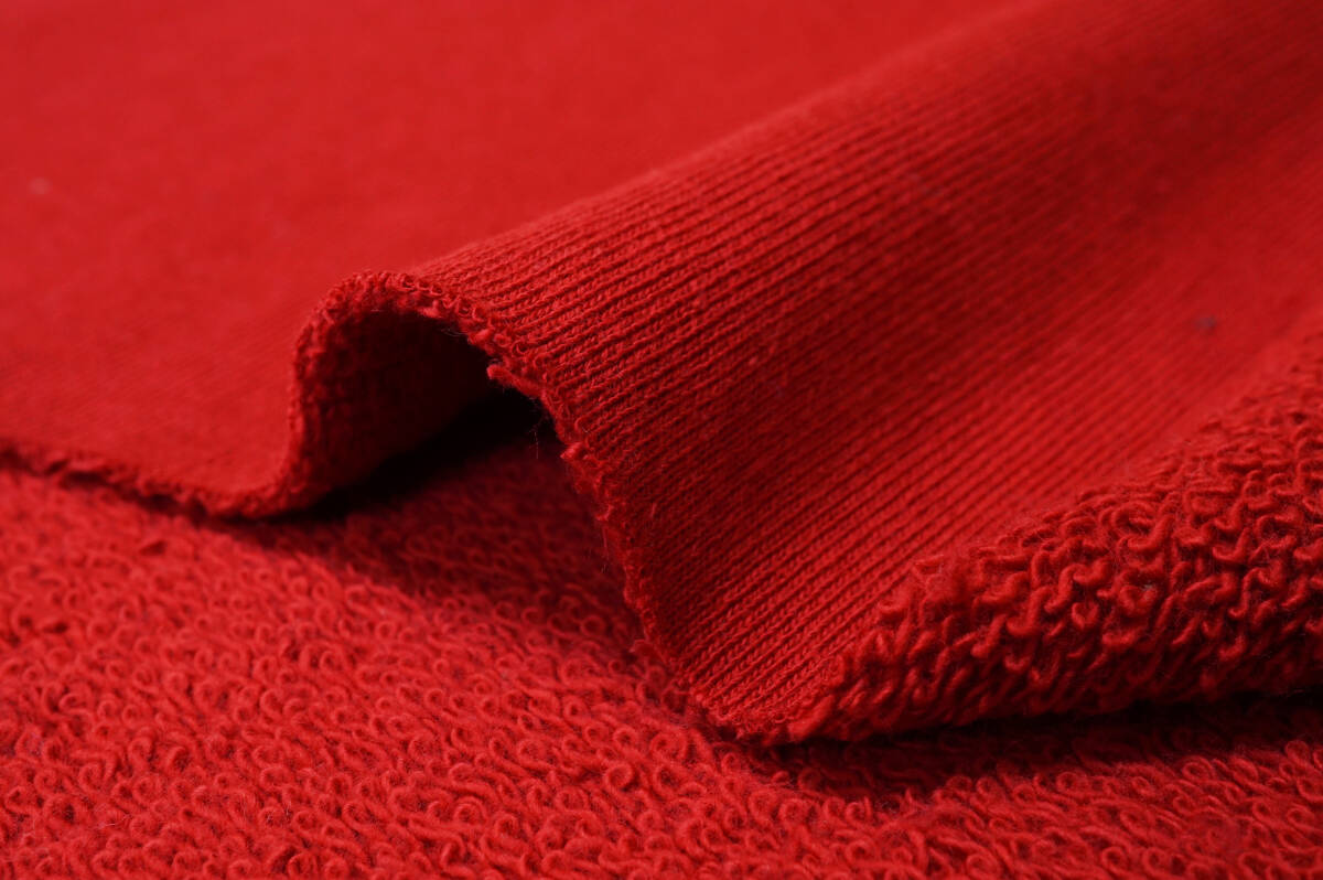 厚さはやや厚地、巾方向にわずかに伸縮性があり、裏毛パイル仕様で、硬さは控えめの程良くソフトな風合いでございます。