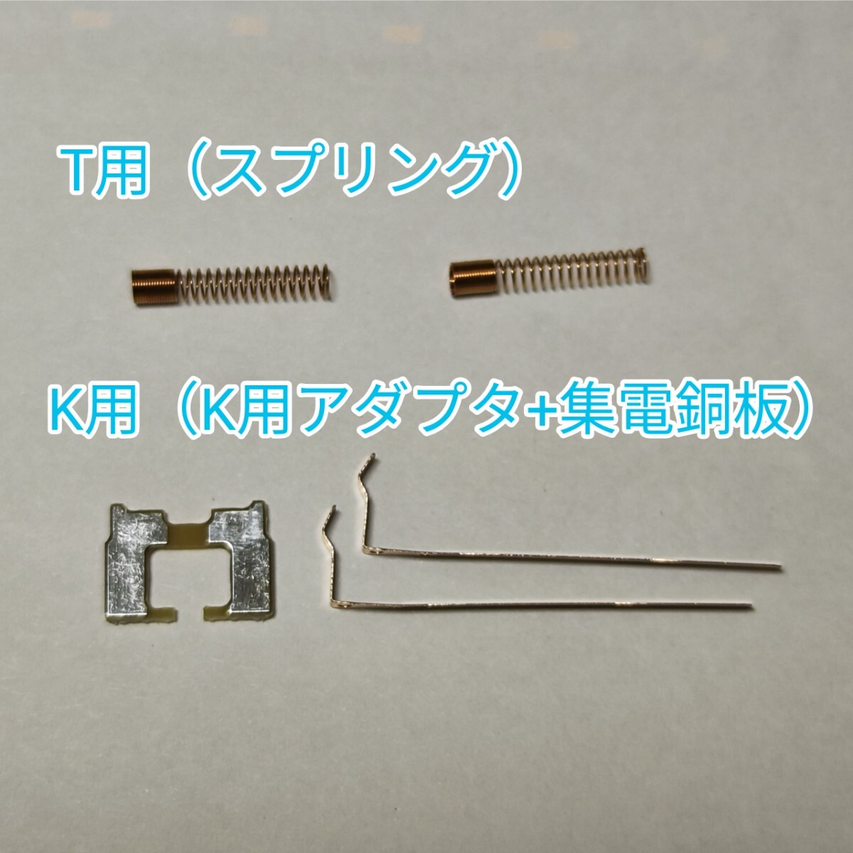 「スプリング」または「K用アダプタ+集電銅板」が付属します。別途部品の用意が必要ないので、はんだ付けするだけでご使用頂けます。