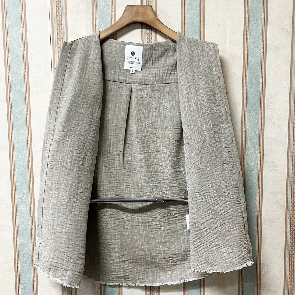 裾は工夫を加えたフリンジデザイン、服全体のシンプルさを保ちながらファッション性を高めています。細かい縦ストライプが、シンプルでありながらモダンな印象を与え、視覚的にスリムなシルエットを強調し、全体のバランスを整えます。胸ポケットはスタイリッシュで、携帯電話や鍵などの小物を収納するのに便利です。