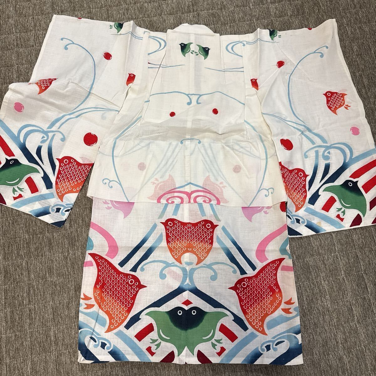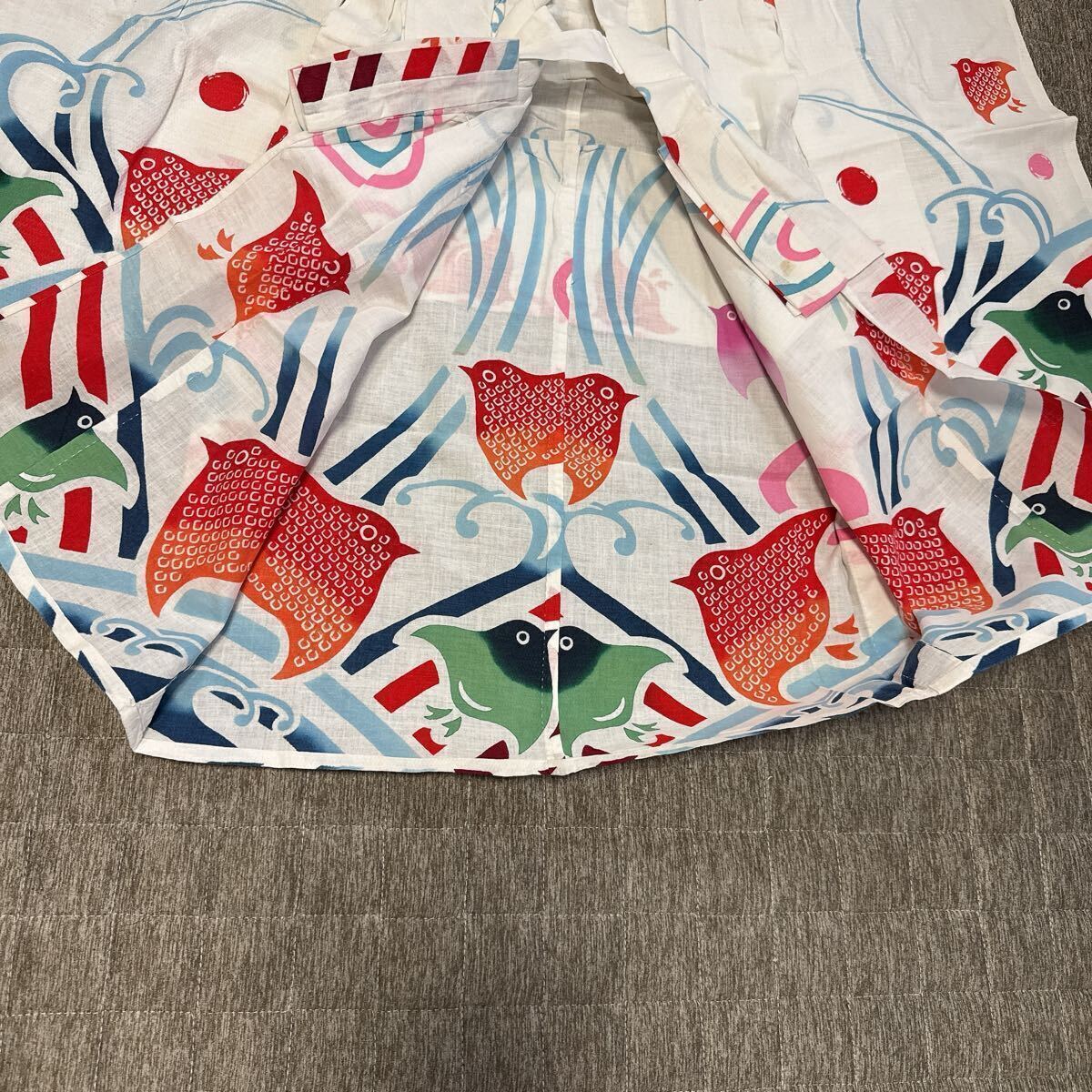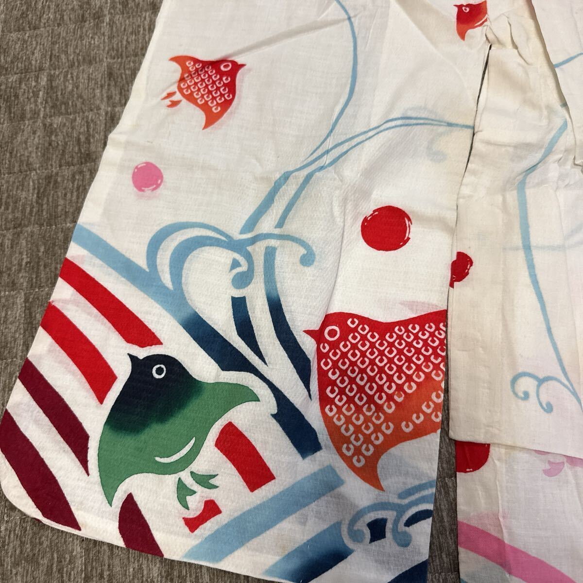 白地に赤・緑・青の金魚や小鳥のような柄が描かれた、とても可愛らしいデザインです。