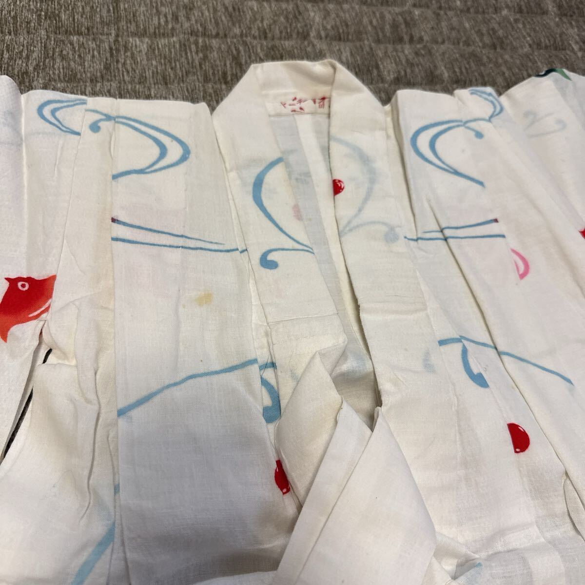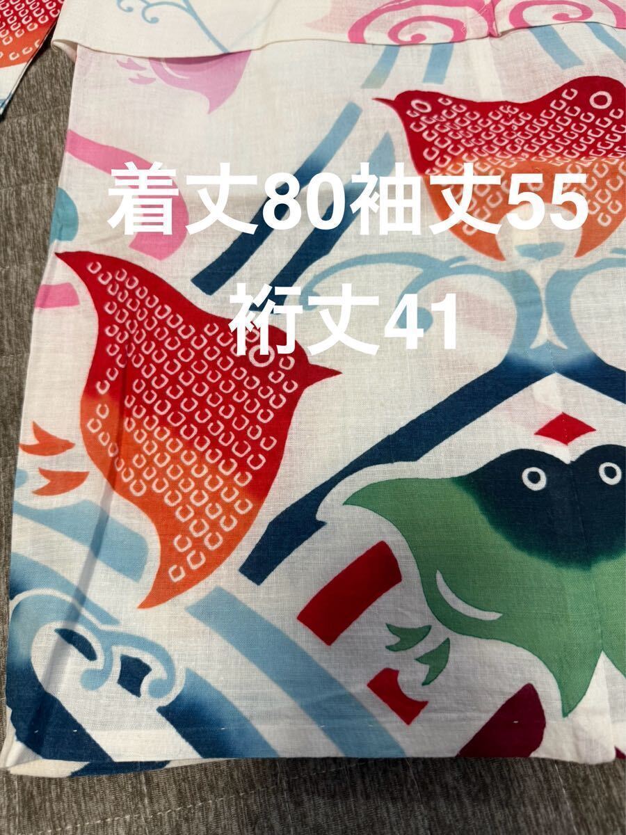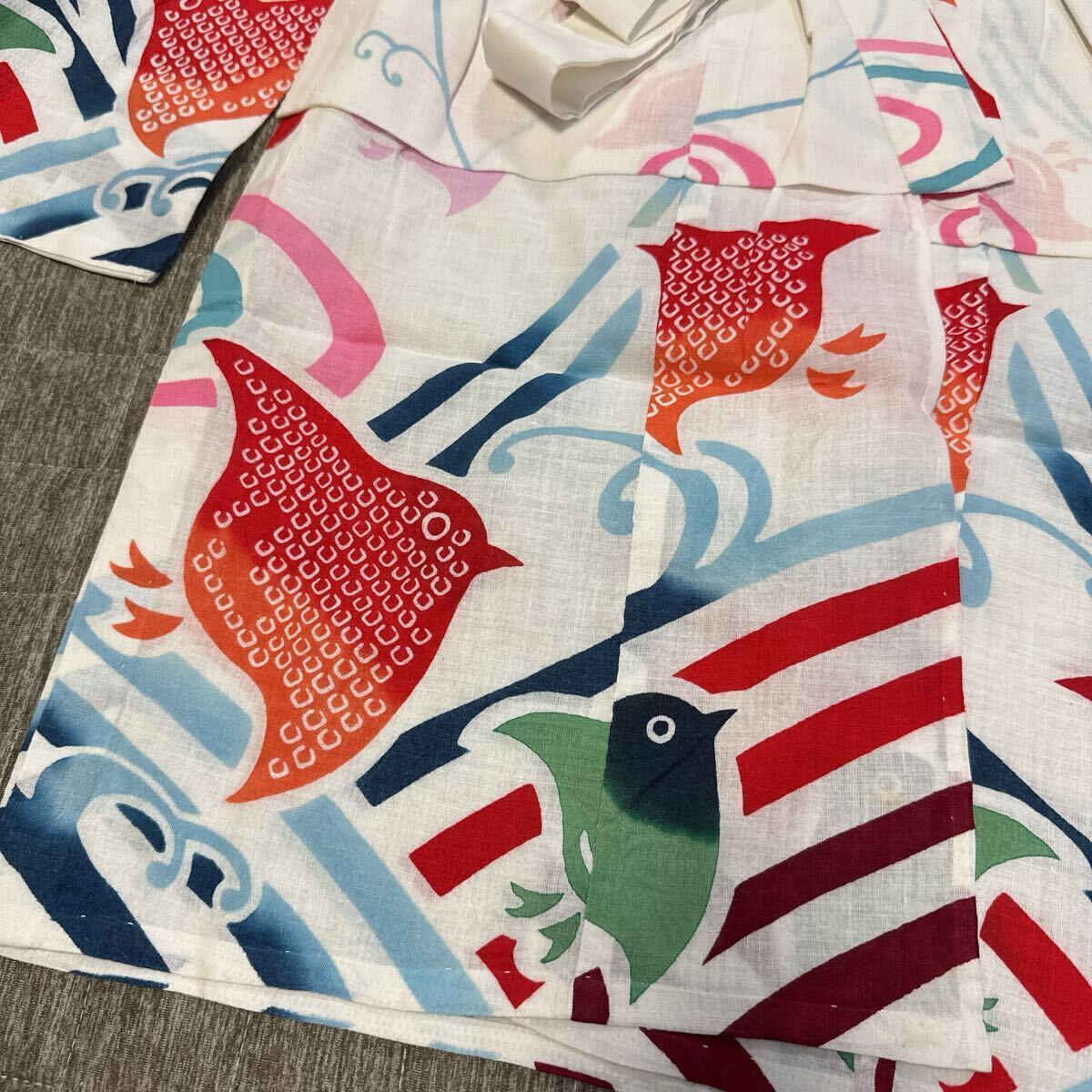 白地に赤・緑・青の金魚や小鳥のような柄が描かれた、とても可愛らしいデザインです。