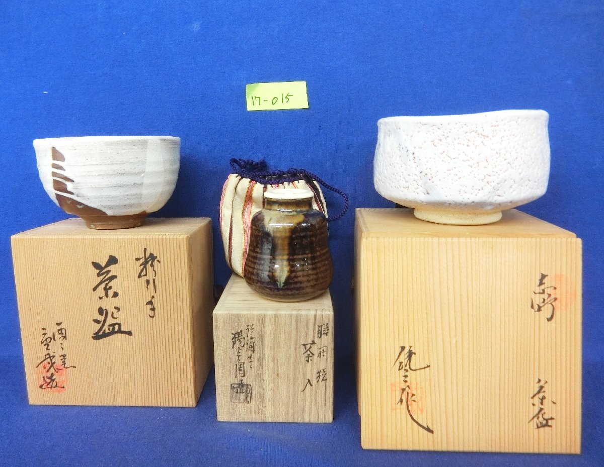 ★17―015★茶器 酉々窯 茶碗/膳所焼 陽炎園 岩崎新定造 茶入/志野焼 養心窯 樋口統三 3点まとめ/茶道具 骨董 古美術 落款 共箱[100]