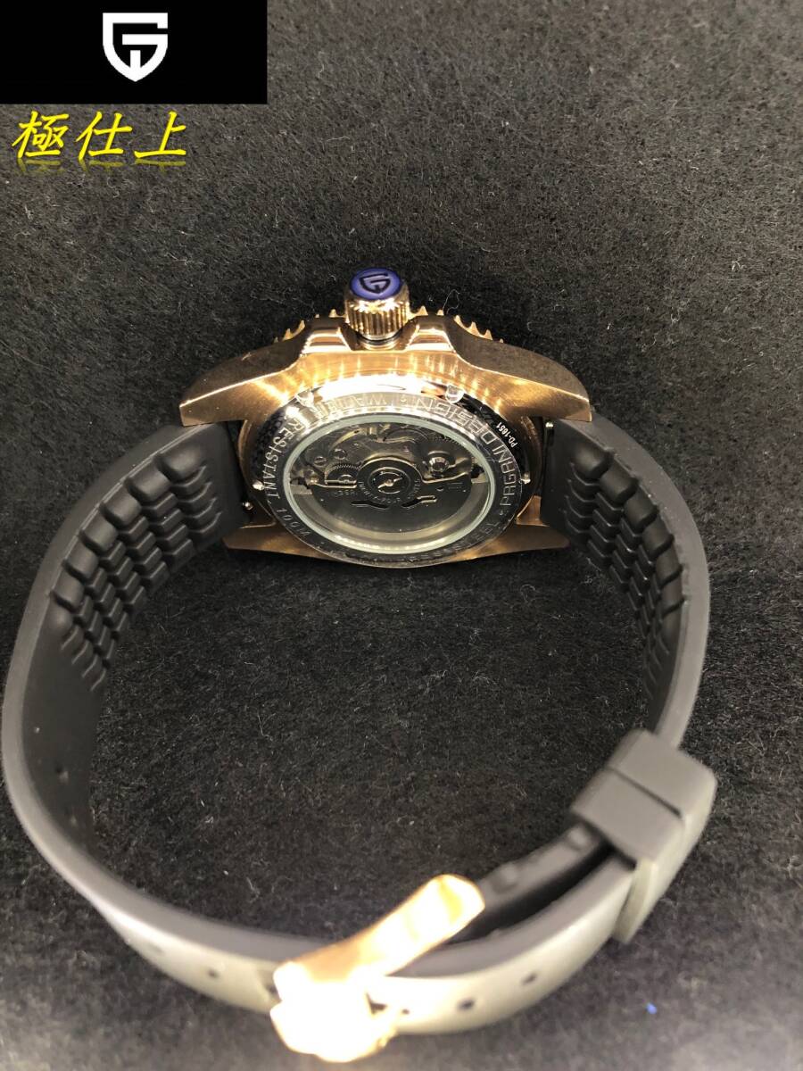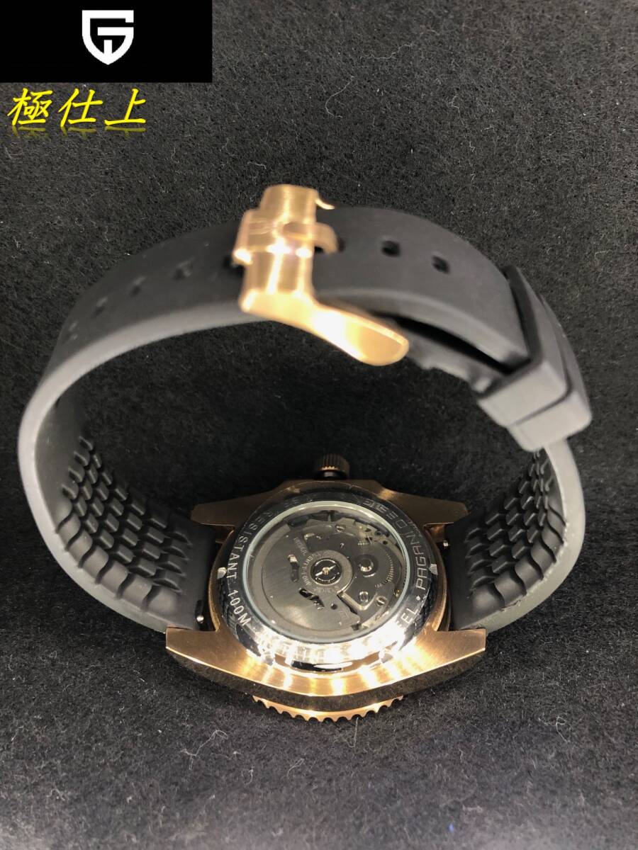 ■とても魅力的な迫力のある時計です。オールローズゴールドとブラックラバーベルトで引き締まった印象です。ラバーベルトなのでギラギラした感じはなく品の良い落ち着いた雰囲気が魅力的です。ローズゴールドを傷つけないよう研磨は最小限としています。(時計本体側)