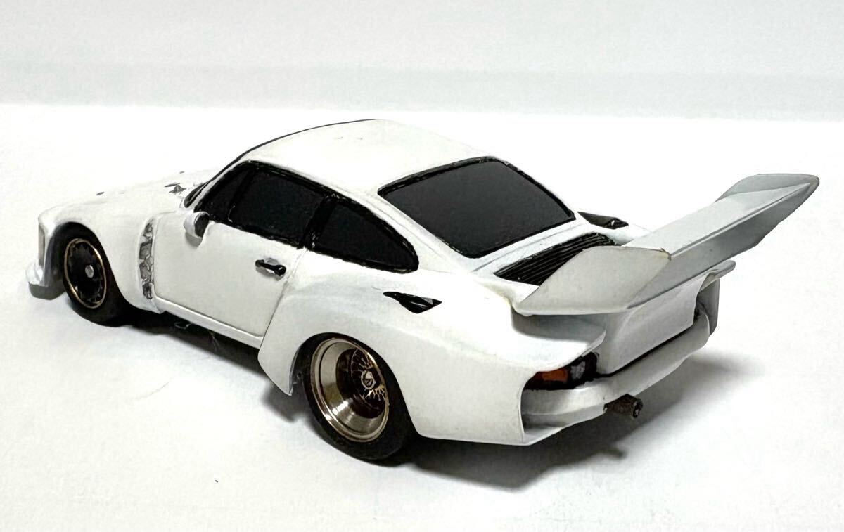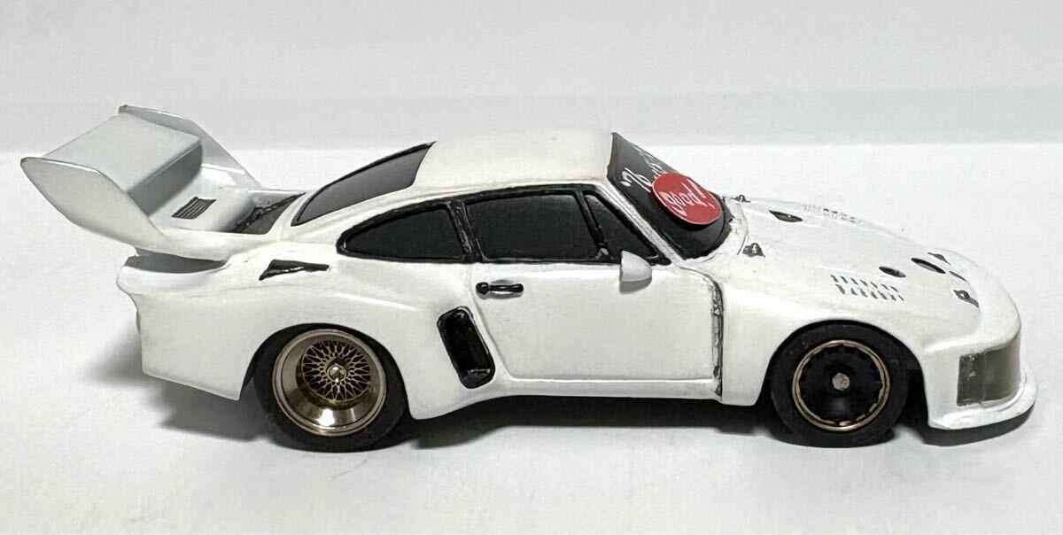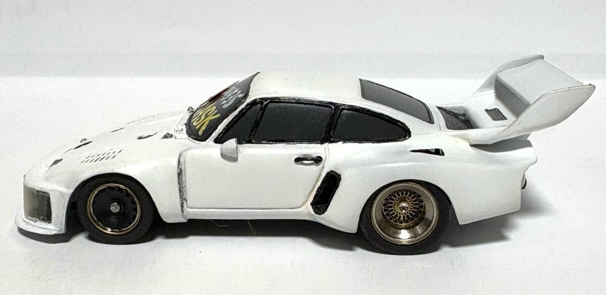 ボディは、ホワイト、ウインドウはブラックアウトされています。クリア掛けはしておりません。黒の塗装は、多少筆塗りのがたつきがあります。ホイールや各部キャップ類もアルミ挽物パーツで作られています。