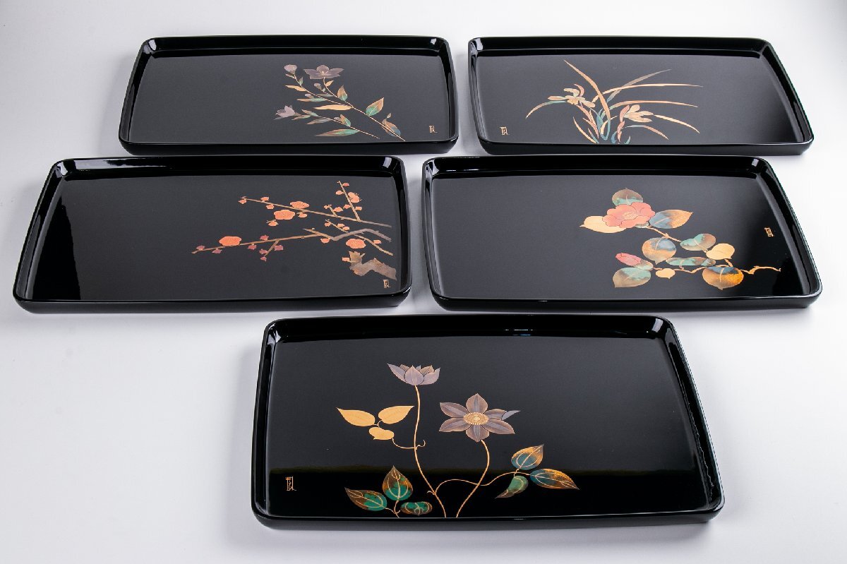 【うつわ】 輪島塗 桜井一良 絵替り卓上膳 5客 共箱 F061 古美術 骨董 古玩 茶道具 日本料理 料亭 懐石