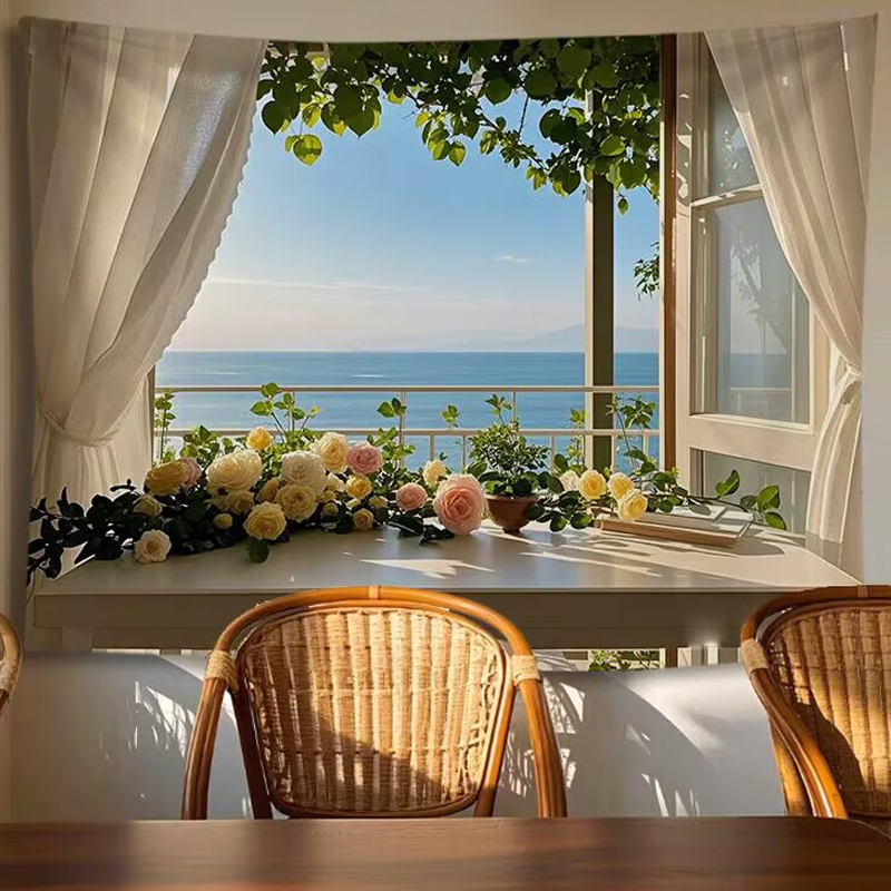 タペストリー 壁飾り 壁掛け装飾布 布ポスター 部屋飾り 背景布 インテリア カーテン 花ある窓からの水平線の絵柄 100x70cm