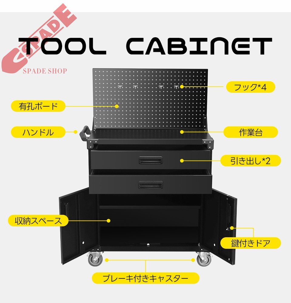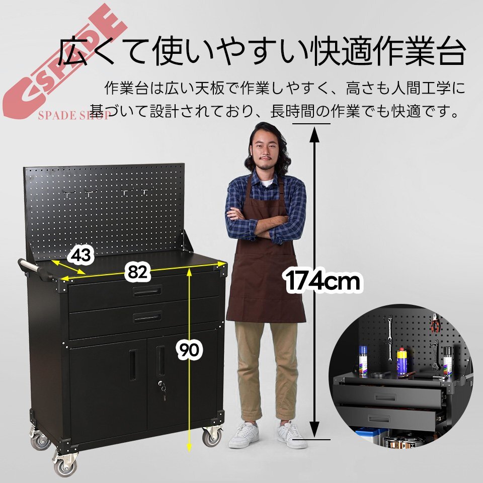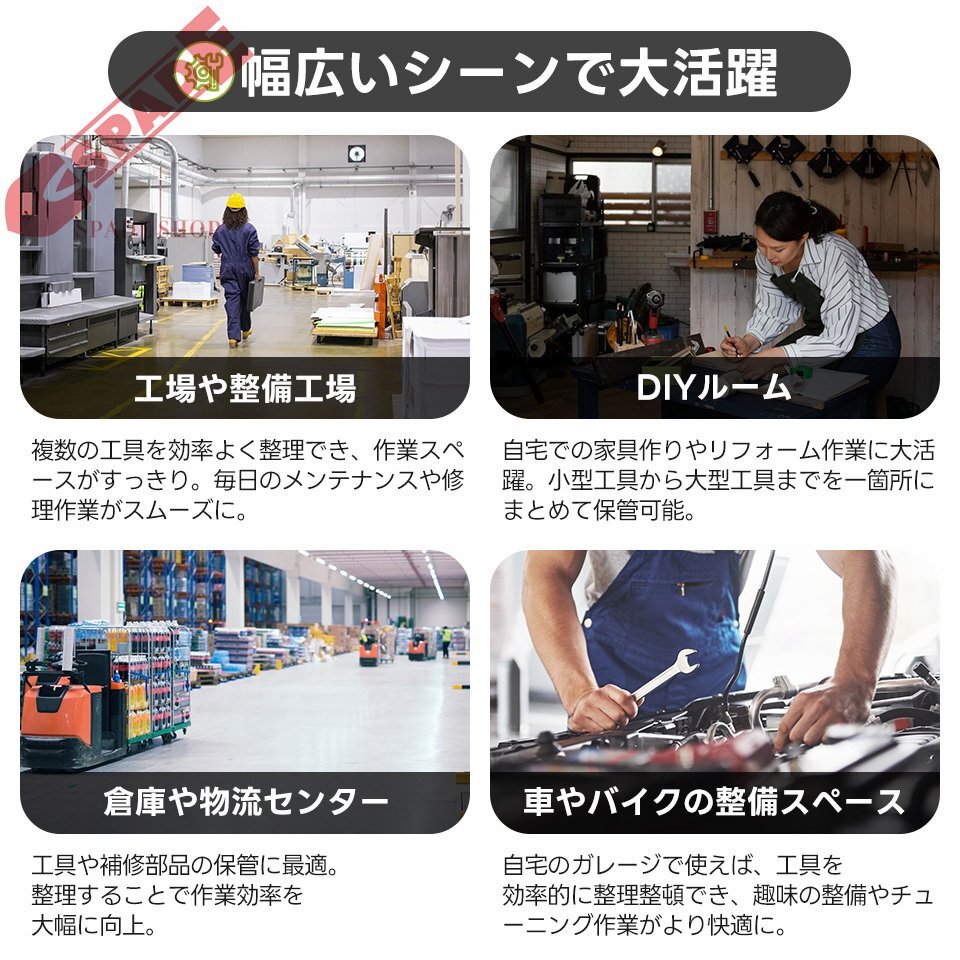 ◆01幅広いシーンで大活躍 工場や整備工場 複数の工具を効率よく整理でき、作業スペースがすっきり。毎日のメンテナンスや修理作業がスムーズに。 DIYルーム 自宅での家具作りやリフォーム作業に大活躍。小型工具から大型工具までを一箇所にまとめて保管可能。 倉庫や物流センター 工具や補修部品の保管に最適。整理することで作業効率を大幅に向上。 車やバイクの整備スペース 自宅のガレージで使えば、工具を効率的に整理整頓でき、趣味の整備やチューニング作業がより快適に。 1フック*4 2有孔ボード 3ハンドル 4作業台 5引き出し*2 6収納スペース 7鍵付きドア 8ブレーキ付きキャスター ◆02フック付き有孔ボード 便利で整理整頓しやすい収納アイテム! 有孔ボードは、作業スペースやガレージ、DIYエリアに最適です。コンパクトながら高い収納力で、スペースを有効活用! 付属のフックで工具や小物を簡単に整理整頓でき、見やすく取り出しやすいデザインで作業効率を向上させます。 ◆03ツール収納の最適解 2段の引き出し 頻繁に使う小型工具を種類ごとに整理可能。スムーズなスライド式で取り出しも簡単です! 全開可能!抜群の収納力! 幅(内寸)69cm  奥行(内寸)33.5cm 高(内寸)8cm 引き出しを完全に取り外せます。高品質なスライドレールを採用しており、スムーズに開閉できます。 ◆04広々とした大型収納スペース 大きな工具や部品も余裕を持って収納でき、作業場のスペースをスッキリ整頓されます。 幅(内寸)79cm  奥行(内寸)37.5cm 高(内寸)43cm 収納スペース内の棚板は高さ調節が可能です。収納する物のサイズに合わせて、自由にレイアウトできます。 ◆05鍵付きで安心 キャビネットのドアには鍵が付いており、貴重な工具やアイテムをしっかり守るセキュリティ機能を提供します。 ◆06広くて使いやすい快適作業台 作業台は広い天板で作業しやすく、高さも人間工学に基づいて設計されており、長時間の作業でも快適です。 ◆07ブレーキ付きキャスター 必要なときには簡単に移動でき、作業中はしっかり固定されるので、安全に使えます。スムーズな移動と確実な固定で、作業環境をさらに快適にサポートします。 キャビネットの8つの角には耐久性に優れたプラスチック製のコーナープロテクターを装備し、本体を衝撃や変形からしっかり保護します。 ◆08左右どちらでも取り付け可能なハンドル ハンドルは左右どちらにも取り付け可能で、使用習慣に合わせて最適な位置に調整できます。 ◆09 1)優れた耐荷重性 本製品の総耐荷重は150kgで、収納ニーズを十分に満たします。 2)高品質な素材 本製品は冷間圧延鋼を使用しており、優れた耐久性と強度を誇ります。どんな作業環境にも安心してお使いいただけます。 3)洗練された仕上げ 角は滑らかに処理されており、手触りも良く、バリや引っかかりの心配はありません。