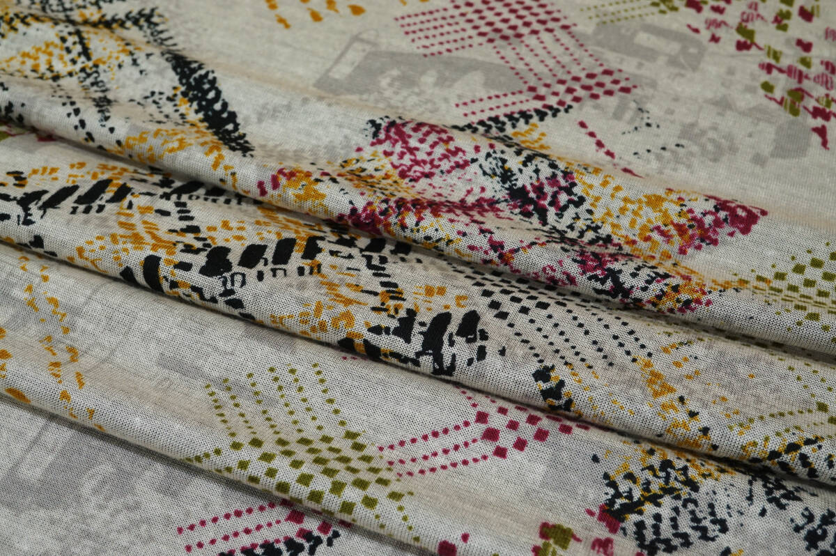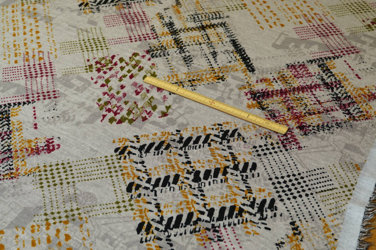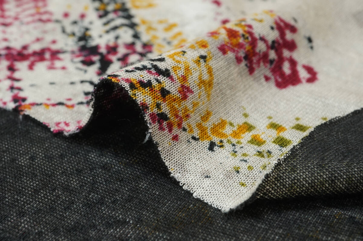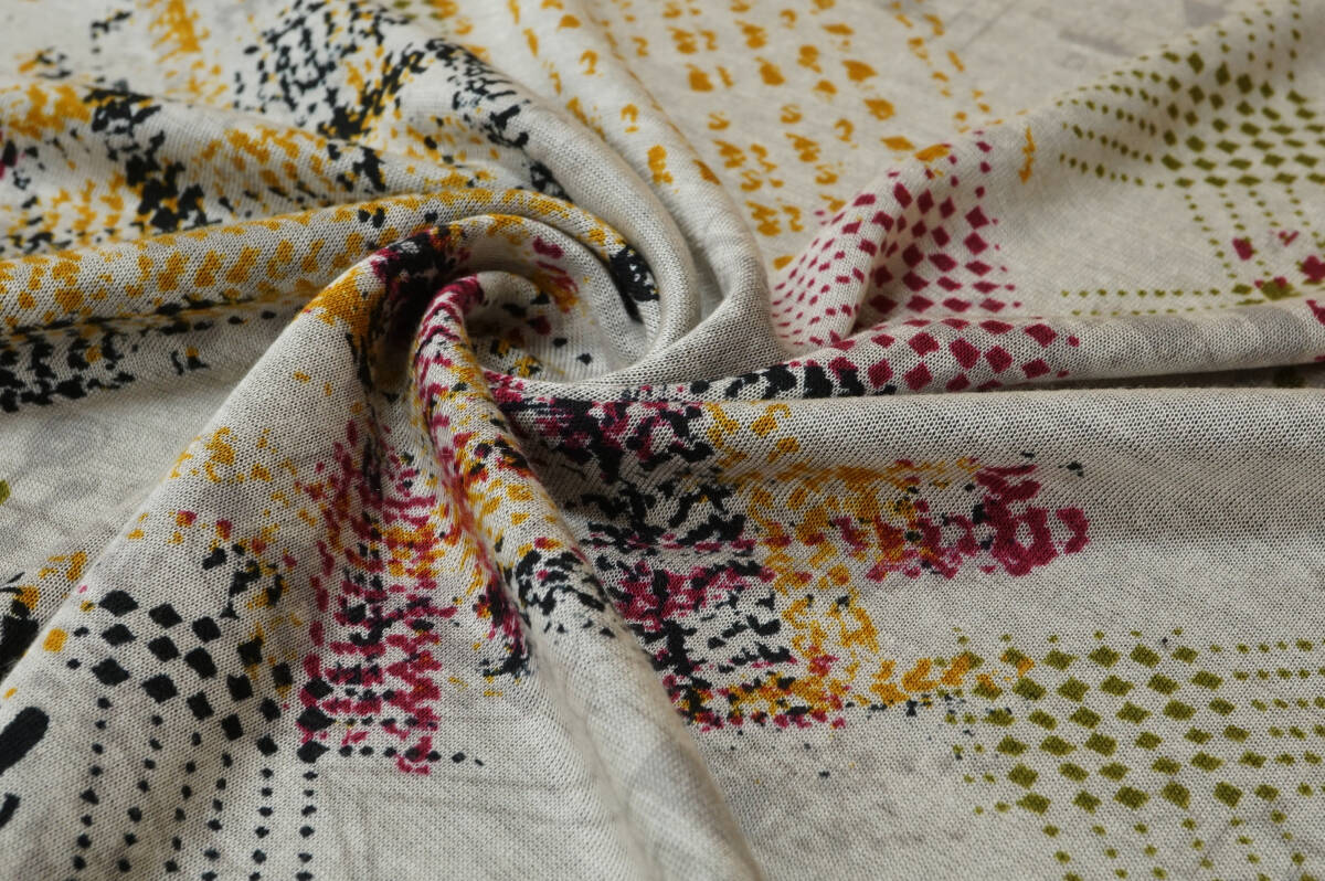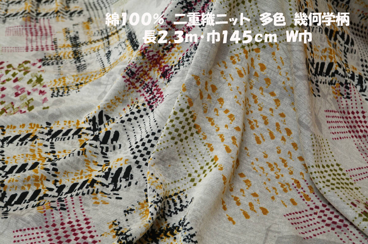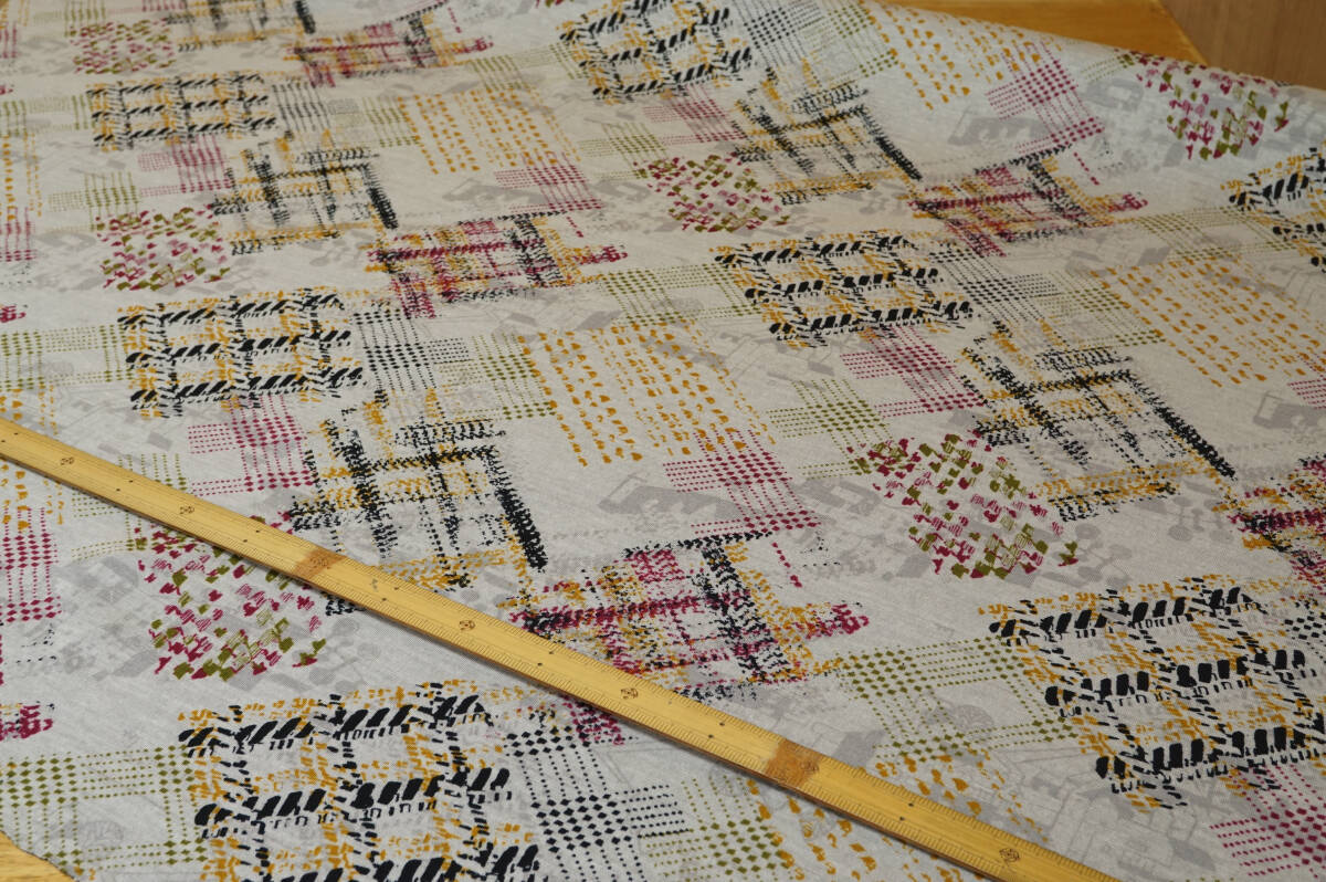 綿100%、中厚~やや微薄程度、ソフト系、1way伸縮、弱めの透け感、表面は渋めのベージュ系ベースに多色の幾何学柄プリントで、裏面は黒でございます。