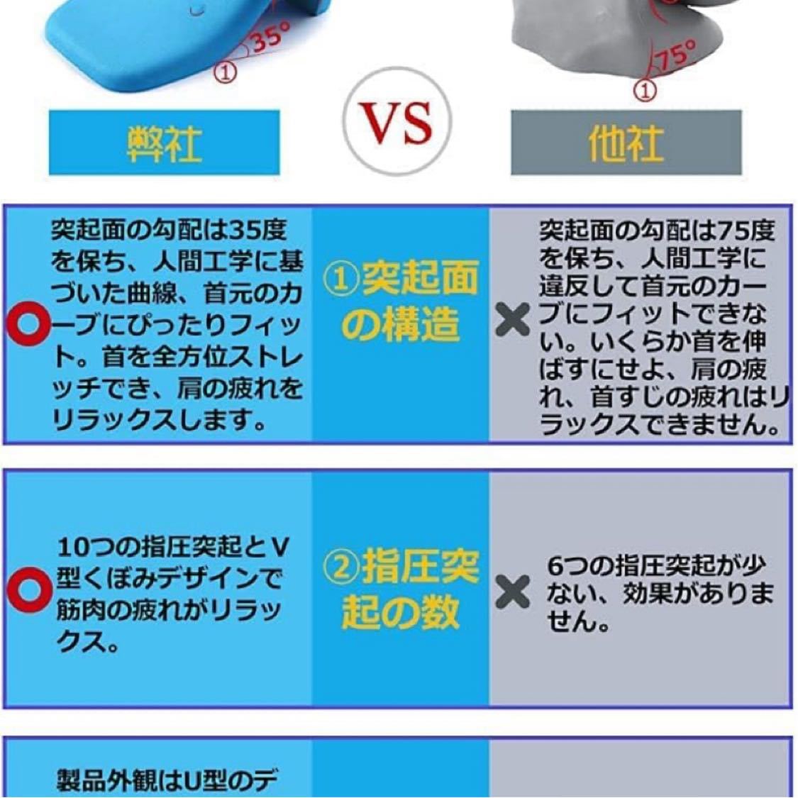 【人間工学設計】■突起面の構造:突起面の勾配は35度を保ち、人間工学に基づいた曲線、首元のカーブにぴったりフィット。■荷重能力:U型のデザインを利用して、重力を効率的に分散させることで、荷重能力が大幅に向上、変形にくい。■指圧突起の数:10つの突起が 首 〜背骨・ 肩甲骨 周りをぐぐっと押します、で筋肉の疲れがリラックス!