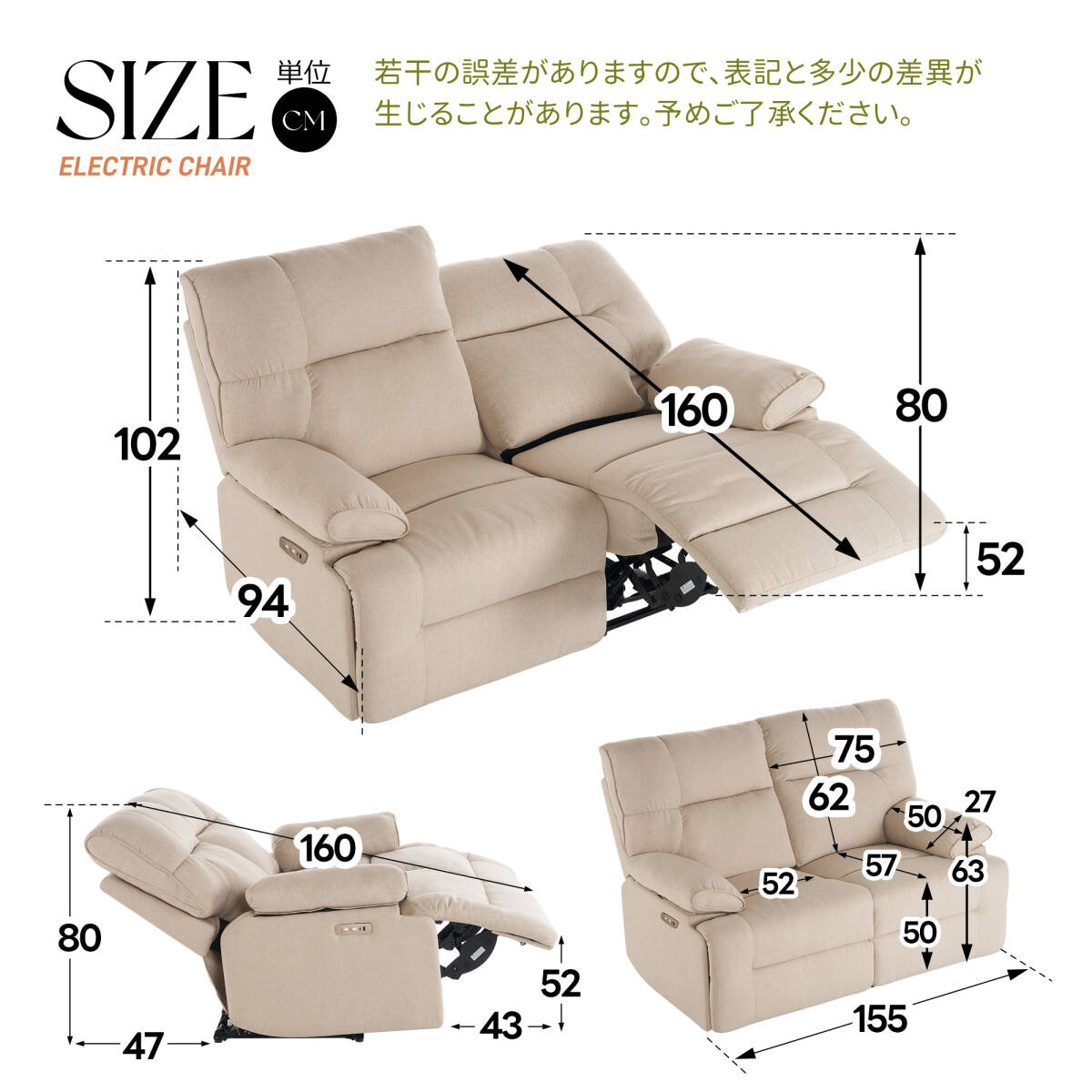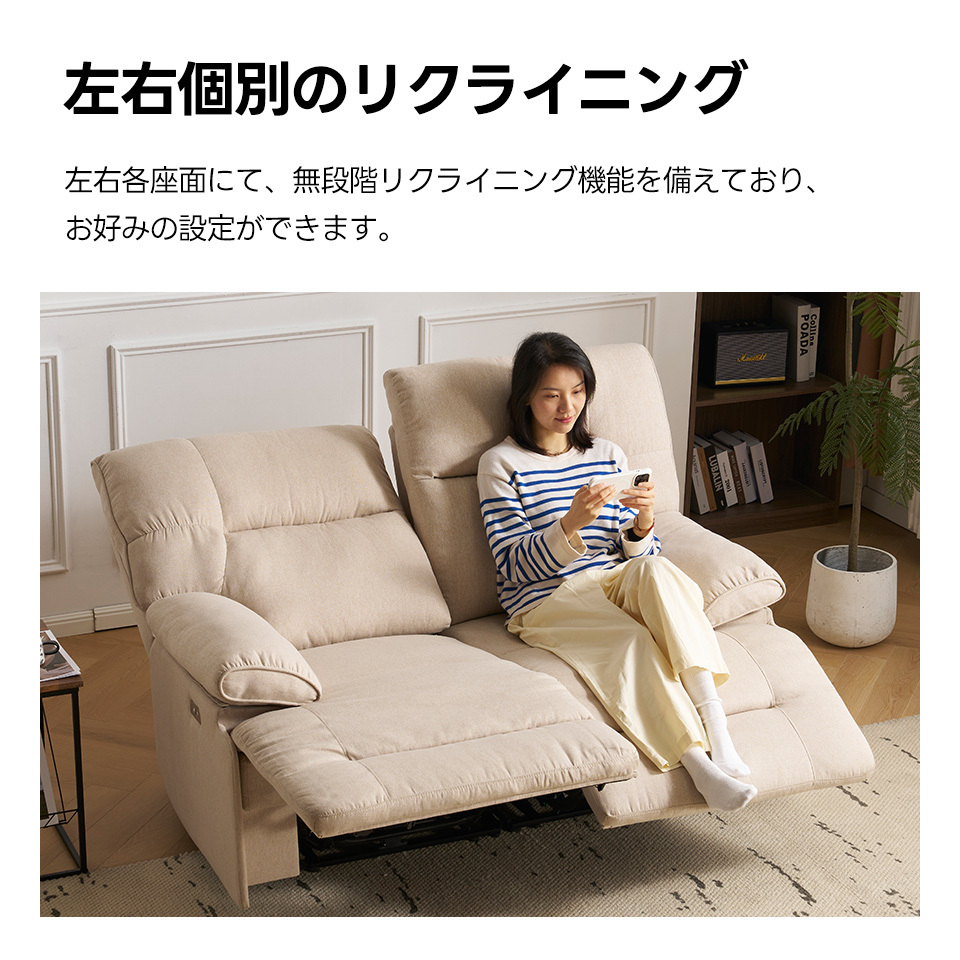 ◆01"モダンライフにぴったりの電動リクライニングソファ 本を読んだり、スマホを楽しんだり、 自分だけの至福の時間を、やさしく包み込まれながら、日頃の疲れも癒してくれます。 シンプルで洗練されたデザインはどんな部屋にもぴったりフィットします。 リラックスした時間をより快適にお楽しみいただけます。 ◆02左右個別のリクライニング 左右各座面にて、無段階リクライニング機能を備えており、お好みの設定ができます。 家族のみんながそれぞれ好みの姿勢でリラックスできて、自由度の高いデザインとなります。 シングルリクライニング ソファ ダブルリクライニング ◆03サイドボタンで簡単操作 サイドについているボタンを軽く押すと自動でリクライニングできます。モダンな雰囲気の金属製スイッチを使用しています。 モデル身長:165cm ◆04約150度のリクライニング リクライニングの最大角度は約150°で、角度を調整すれば楽な姿勢でくつろげます。 まるでベッドのような快適さで、思わずうたた寝してしまうこともあります。お好みの角度でリラックスした姿勢を楽しめる贅沢な機能です。 ◆05頭部から脚部まで、健康をしっかりと守る 体の部位ごとに最適な曲線と柔軟性を設計し、全方位で身体によりフィットする圧力分散を実現します。座っても、寝転んでも、頭から足先まで至高の快適です。 #1.ハイタイプヘッドレスト 首や肩の負担を軽減し、頭部を優しくサポートするハイタイプデザイン。長時間の使用でも疲れにくい設計です。 #2.背もたれ ボリュームたっぷりの柔らかい背もたれは、優雅に包み込まれる感覚を提供します。2段構造の背もたれが腰を優しく支え、快適な座り心地を実現します。ゆったりとしたリラックスタイムをお楽しみいただけます。 #3.弾力のある座面 程よい硬さのウレタンフォームが体をしっかり支え、長時間座っていても疲れにくい設計です。 快適な座り心地で、日常の疲れを感じさせません。" #4.フットレスト 足をゆったりと伸ばせる広さで、快適なリラックスを実現。足元から全身までリラックスできます。 #5.肘掛け 肘掛けが大きく、ゆったりとしたサポートを提供するため、長時間の使用でも疲れにくい設計です。高さが適切な肘掛けが、腕を自然に支え、体に負担をかけません。 地面まで61cm ◆06強固なリクライニング機構で、耐久性と快適さを兼ね備える。 本品のリクライニング機構は、SGS国際テストに合格しました。159kgの荷重下で、25000回の循環テストを行い、構造的な損傷や機能的な故障は発生しませんでした。 また、リクライニング機構の塗料テストも実施しており、本製品には重金属は含まれていません。安心してご使用ください。 耐荷重:159kg 運転回数25000 ◆07他にも、見逃せないこだわりがいくつかございます。 #1.充電のUSBポートとType-C搭載 USBポートとType-Cが装備されているので、リラックスしながらスマートフォンの充電が手軽に行えます。日常の生活に便利さをプラスします。 ※安全性を確保するため、USBポートには低電圧を採用しています。スマートフォンのみ充電可能で、タブレットの充電には対応しておりません。" #2.電源コード収納スペース付き 電源コードを収納できるスペースがあります。コードを使わないときは、裏側のカバーを簡単にめくり、中に収納することができます。マジックテープでしっかりと固定されているため、きちんと隠れ、部屋がすっきりとします。 #3.2梱包でお届けするので、大きすぎて搬入できない心配はない。 梱包サイズ:約76*66*65(cm)×2 重量:約35kg×2